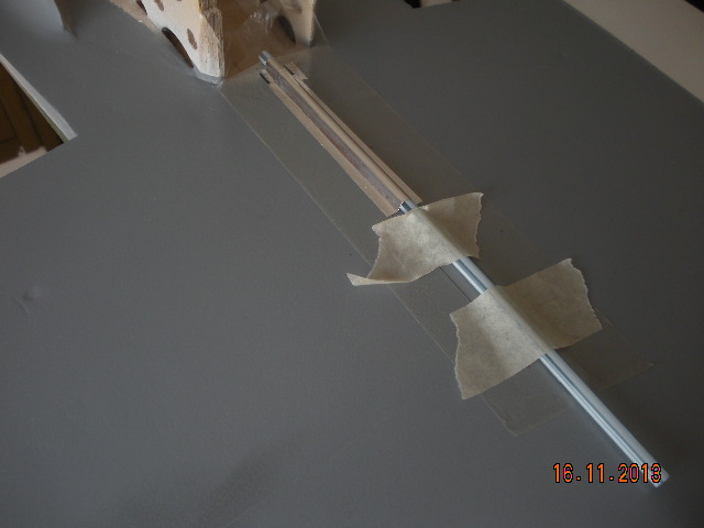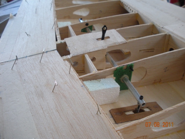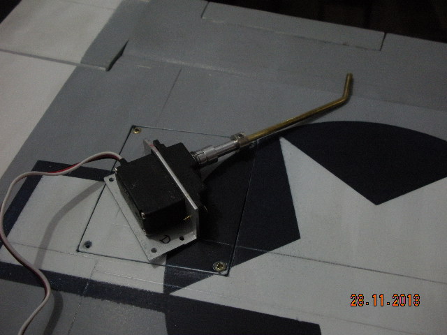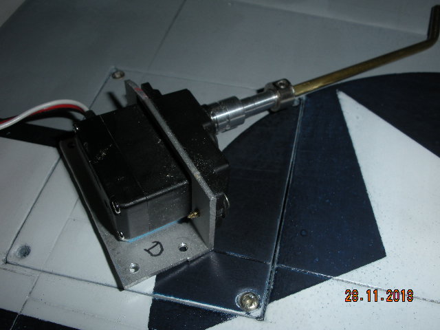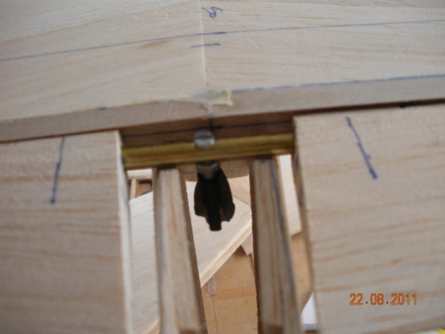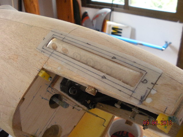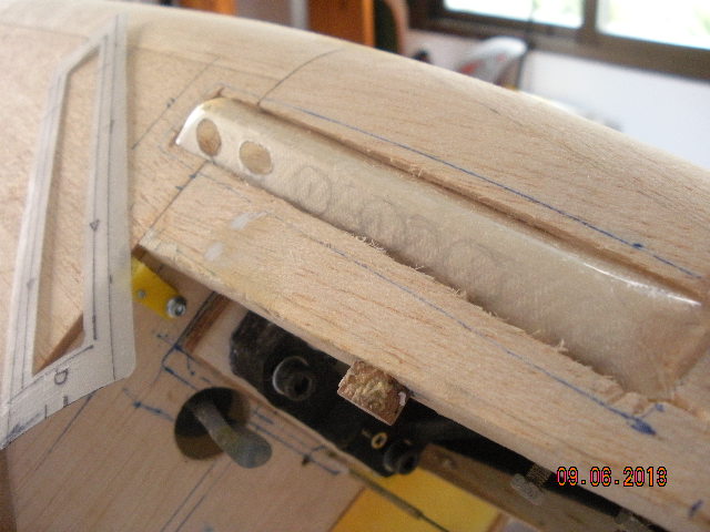 He puesto el rail guía de la cúpula, con un cuadradillo de latón ranurado. También el servo que acciona la válvula del tren de aterrizaje, que la he situado en el interior de ala entre las dos costillas centrales, Va sujeta con un tornillo de nylon.