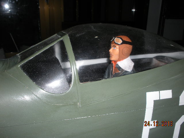 El piloto ya está dentro con ganas de volar. He puesto los tubos de escape de aluminio con un cordón de Araldit para metales aplicado con la punta de una alfiler simulando la soldadura. Están pintados con aerografo en color cuero de Humbrol y unos toques de negro metálico.
