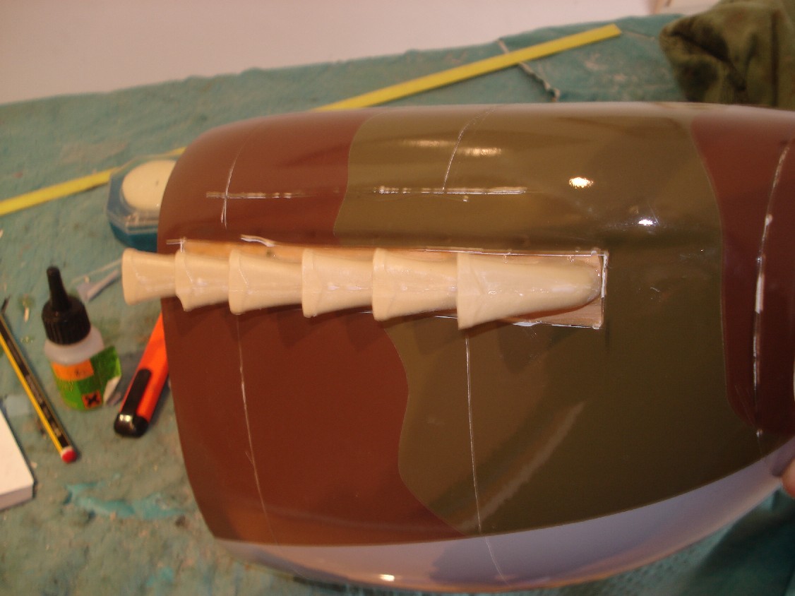 Ya he colocado los radiadores bajo las alas con unas pequeñas rejillas en su interior,y empezamos con el montaje de las ametralladoras y los domos. :D