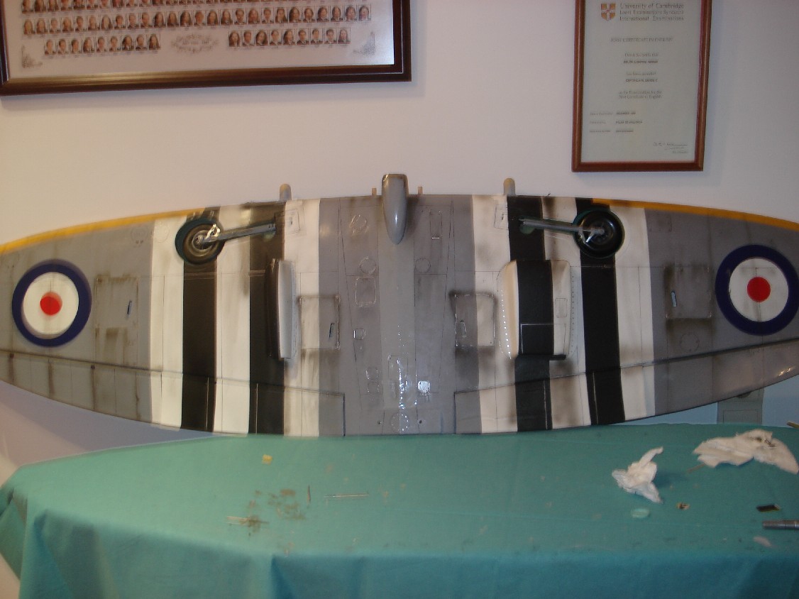 bueno,hola a todos,ha caido en mis manos un spitfire de Rc tecnic,de 1,80 mts,el avion en si viene decorado en camuflaje en la parte superior, y en color gris liso el la parte inferior.Asi que me he decidido ha hacerle las bandas de invasion con pintura en spray,y añadir algun detalle mas como cockpit,espejo retrovisor y ruedas mas a escala asi como tren amortiguadoy cañones.Tambien le he quitado el brillo al oracover con un estropajo muy fino para a continuacon marcar los paneles con la punta de un lapiz.Todo el conjunto lleva una capa de barniz de poliuretano semimante titan.por s ha alguien le pueden servir de algo os dejo unas fotos. :)Por cierto,los escapes ,cañones y espejo son fabricados en resina,a escala 1/6.procedentes de un fabricante de accesorios ingles.