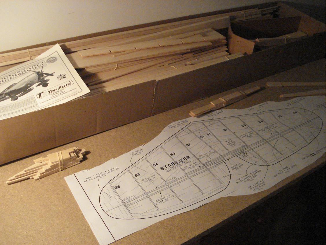 Hola finalmente,el kit ya ha llegado ,despues de clasificar las maderas segun su sitio final,e empezado a montar el estabilizador,echando mano de ciano,la cosa cunde!!.