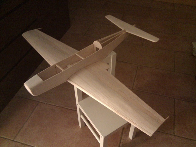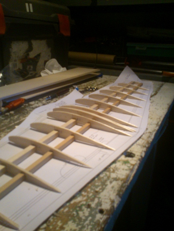 En cuanto a la construcción del ala no me parece complicado, simplemente hay que realizar dos semialas en dos "planos" ondulados respecto al plano de la mesa de trabajo. Lo que realmene me preocupa es el ensamlaje de las dos alas.
