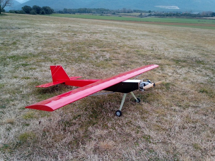 El avion tiene una envergadura de 3metros i una longitud total de 2,3. El motor es un bicilindrico de 100cc con una traccion de 15kg i el peso total del avion unos 12kg.