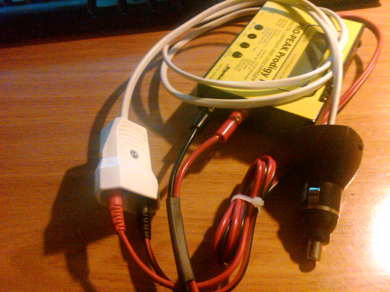 Es tan pequeña la aportación, que no me explayaré mucho, pero bueno, esto es lo que hay; tengo unas bananas que tienen un tornillo para retener el cable, no van soldadas (aún que yo las sueldo de todos modos) y me da un poco de miedo, que en un empalme de cable, estos tornillos del posititvo y negativo se toquen. Para evitar esto, se me ha ocurrido meter las bananas hembra en un soporte que evite que esto ocurra, así que me he hecho un cargador para coche, utilizando un cargador de movil antiguo (vaya usted a saber donde estará ese movil ya . . .) y un enchufe eléctrico normal, como podeis ver en las fotos.