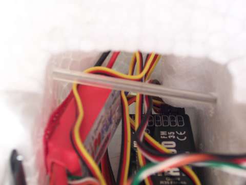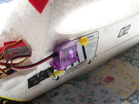 Puse el servo como lo puso cronico pero para sugetar la goma puse una chicheta (amarilla) una varilla y directamente a la otro estremo de la goma, y el paraca en la panza.