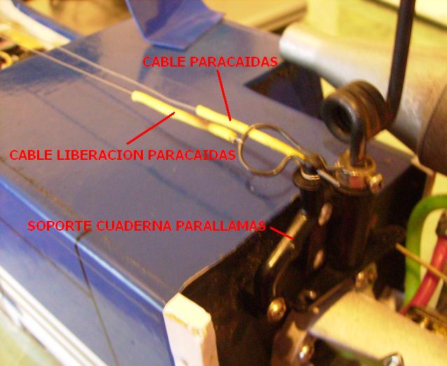 El sistema que he empleado es muy sencillo y barato, así que cualquiera que se anime puede instalarlo. El paracídas se guarda dentro de un pequeño estuche metálico dentro del cual también se monta el servo de apertura, al abrirse la compuerta el paracaídas cae por su propio peso y se despliega, estando éste enganchado al avión en la cuaderna parallamas. El canal de liberación es un interruptor de 3 posiciones, pulsando en un extremo se despliega el paracaídas y pulsando hacia el otro se desprende el paracaídas del avión; de esta forma se puede volver a despegar o bien nos premitiría librarnos de él si por casualidad de liberara en vuelo. Pongo unas fotillo pa ilustrar el tema. Saludos y buenos vuelos a todos.