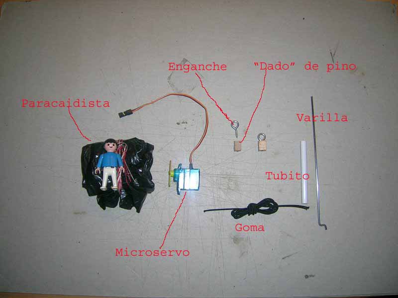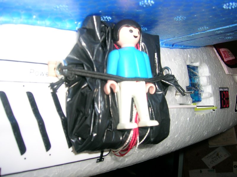 Asi cuando actuas sobre el interuptor de la emisora, se libera la goma y el paracadista cae por su propio peso,...y la goma queda colgando de la "barriga"