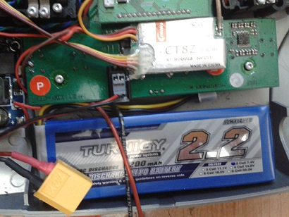 Tambien he instalado una bateria lipo de 2 elementos que me daran un maximo de 8,4 voltios, pero para sacarle un maximo rendimiento, tambien instale un convertidor DC-DC regulable en el voltaje de salida, que me suministrara 12,5 voltios solo al modulo.