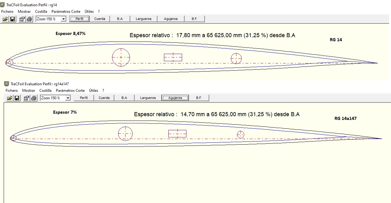 Otro punto es, no es lo mismo un rg14-il a 8,5% queun rg15 a 8,9% ..... Insisto, el espesor o grosor del perfil es solo una variable para referencia, existen pefiles como los HQ que en su nombre incluyen espesor y porcentaje de la cuerda donde está el maximo espesor que nos el caso de los RG que van por serie para información específica