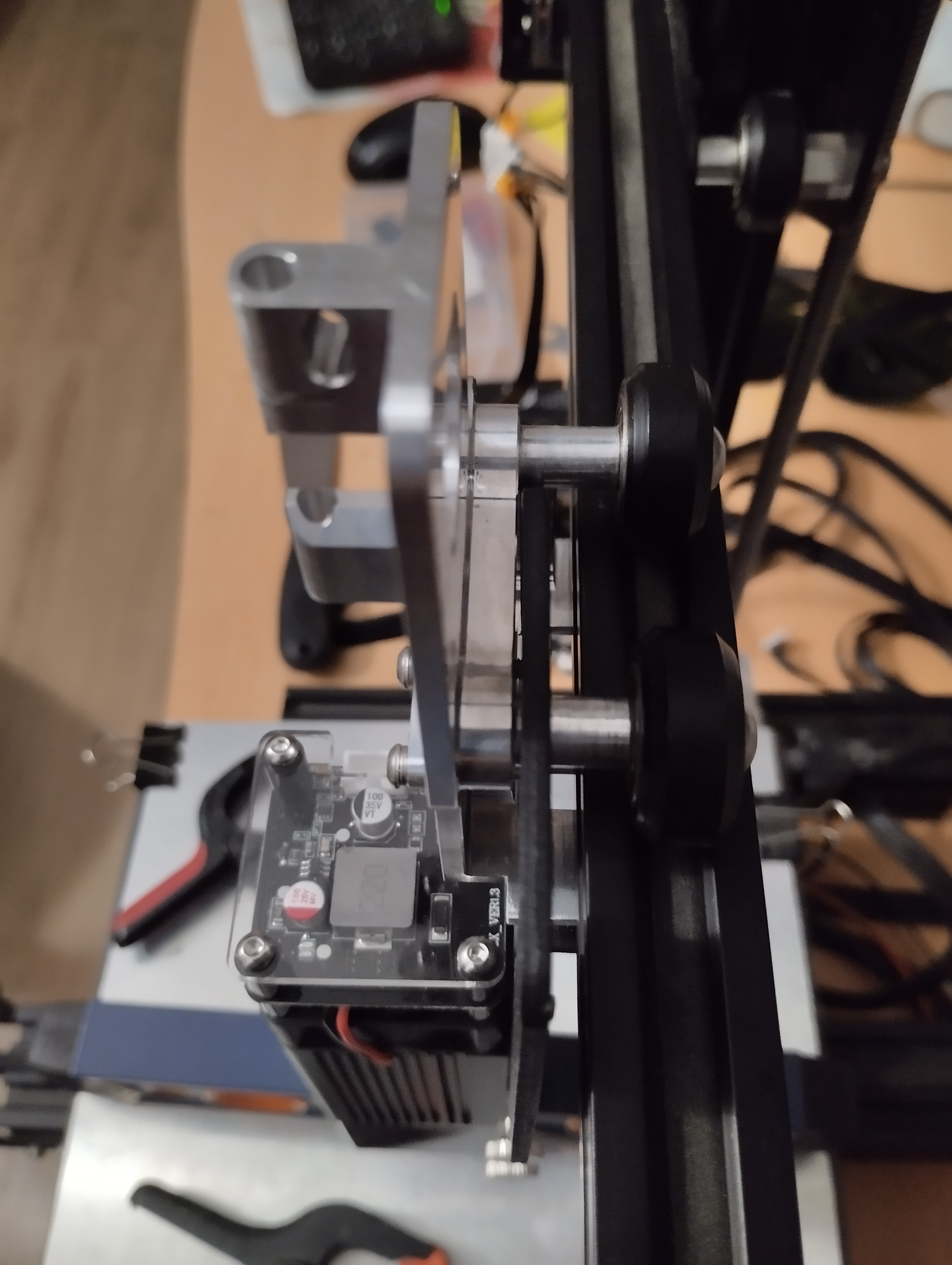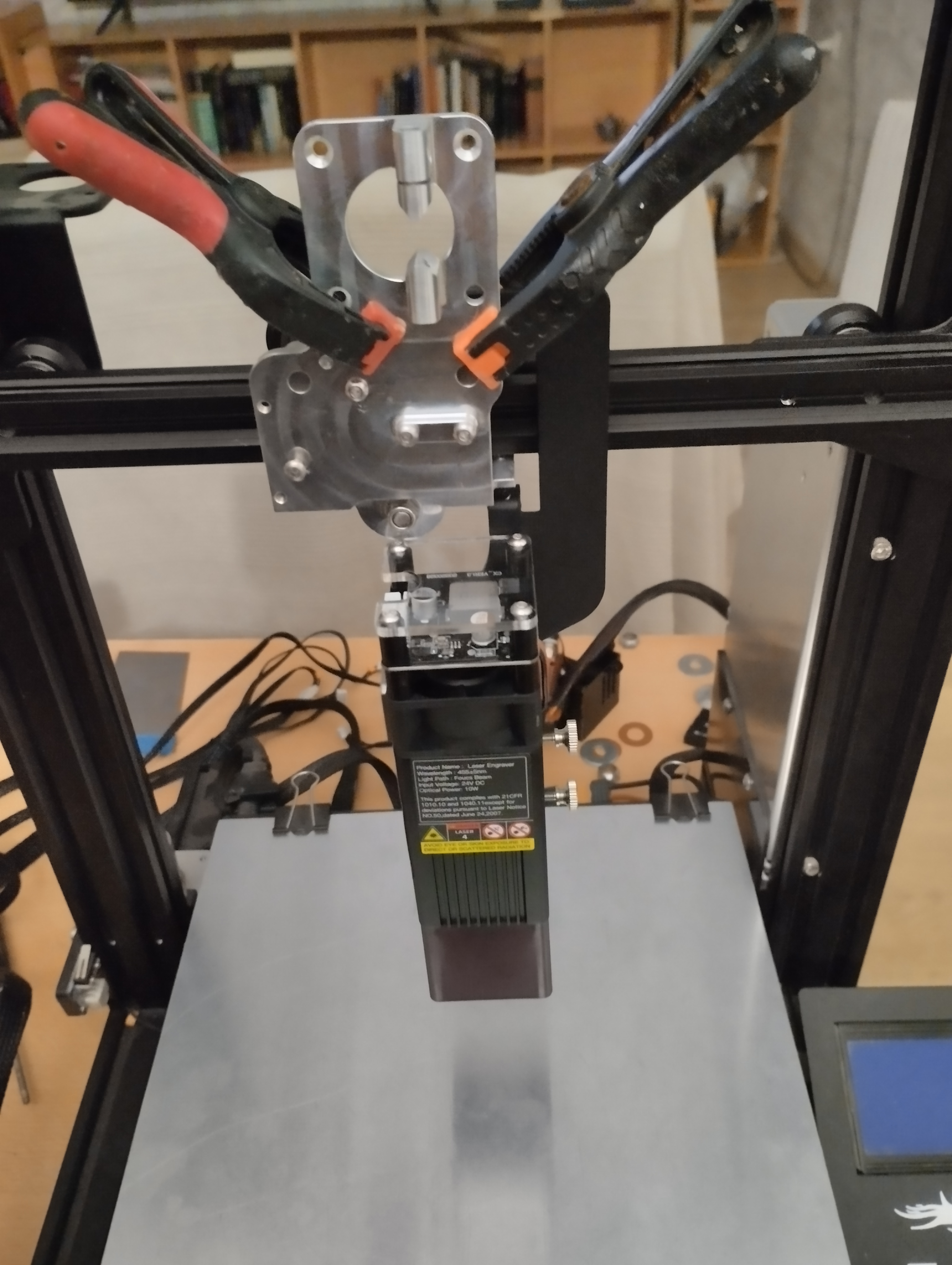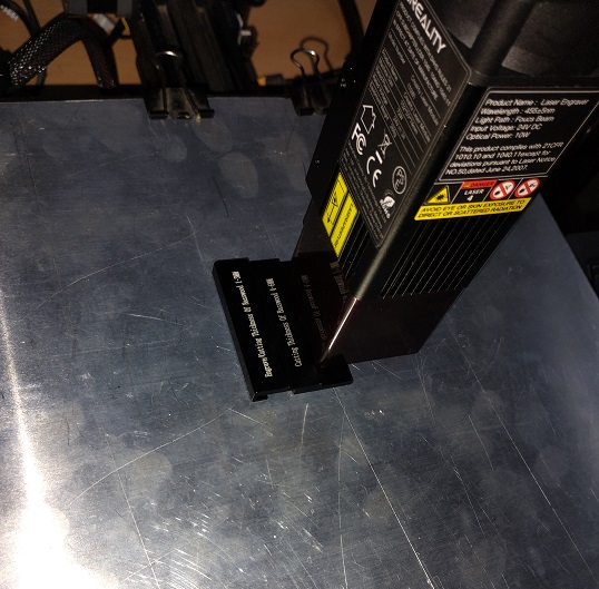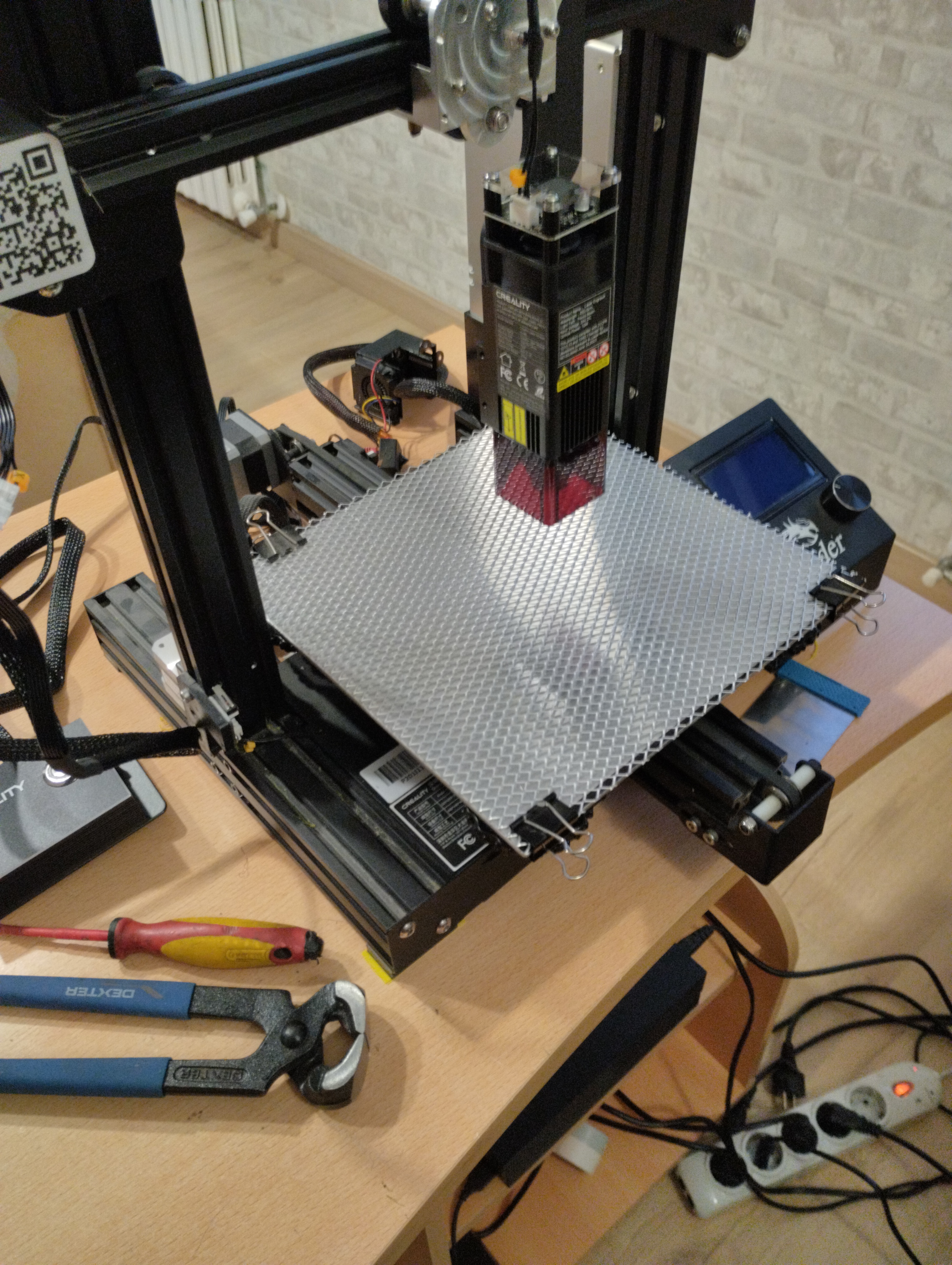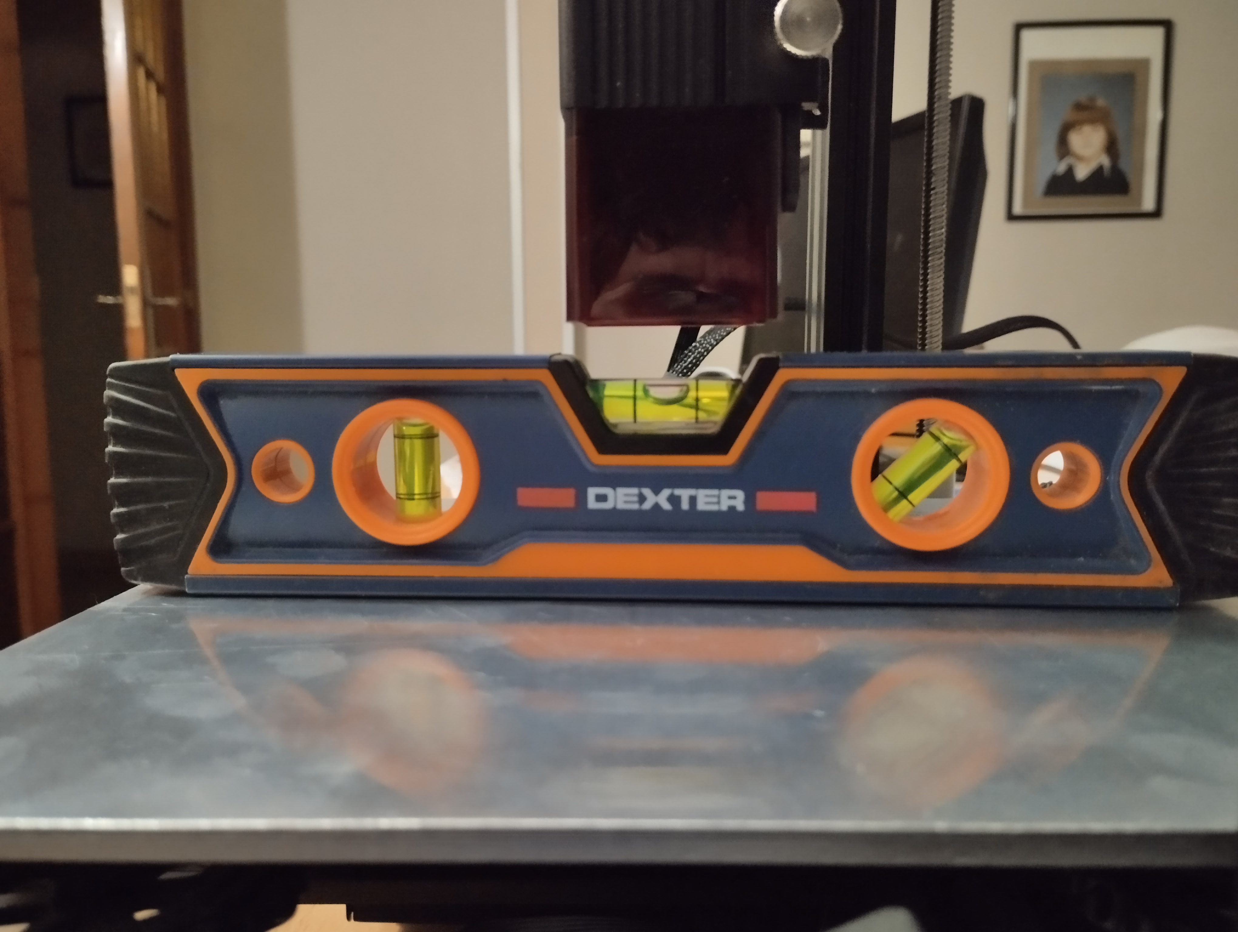 En lo que al eje Y se refiere, no esta mal, digamos cuasi perfecto, y con el nivel en el X, lo mismo; moviendo ambos ejes, igual; no está nada mal ese paralelismo, digamos cuasi, porque por medios técnicos no podemos verificarlo, solo podemos ajustar , así que será el corte el que nos dé la prueba notoria para saber si hay que reajustar y en que eje o no, mañana iré con el software Lightburn, que con esas dos pinzas puede funcionar perfectamente, provisionalmente obvio. Tengo ganas locas de ver como corta el rayo yá. Por cierto , viene las gafas de protección incluidas.