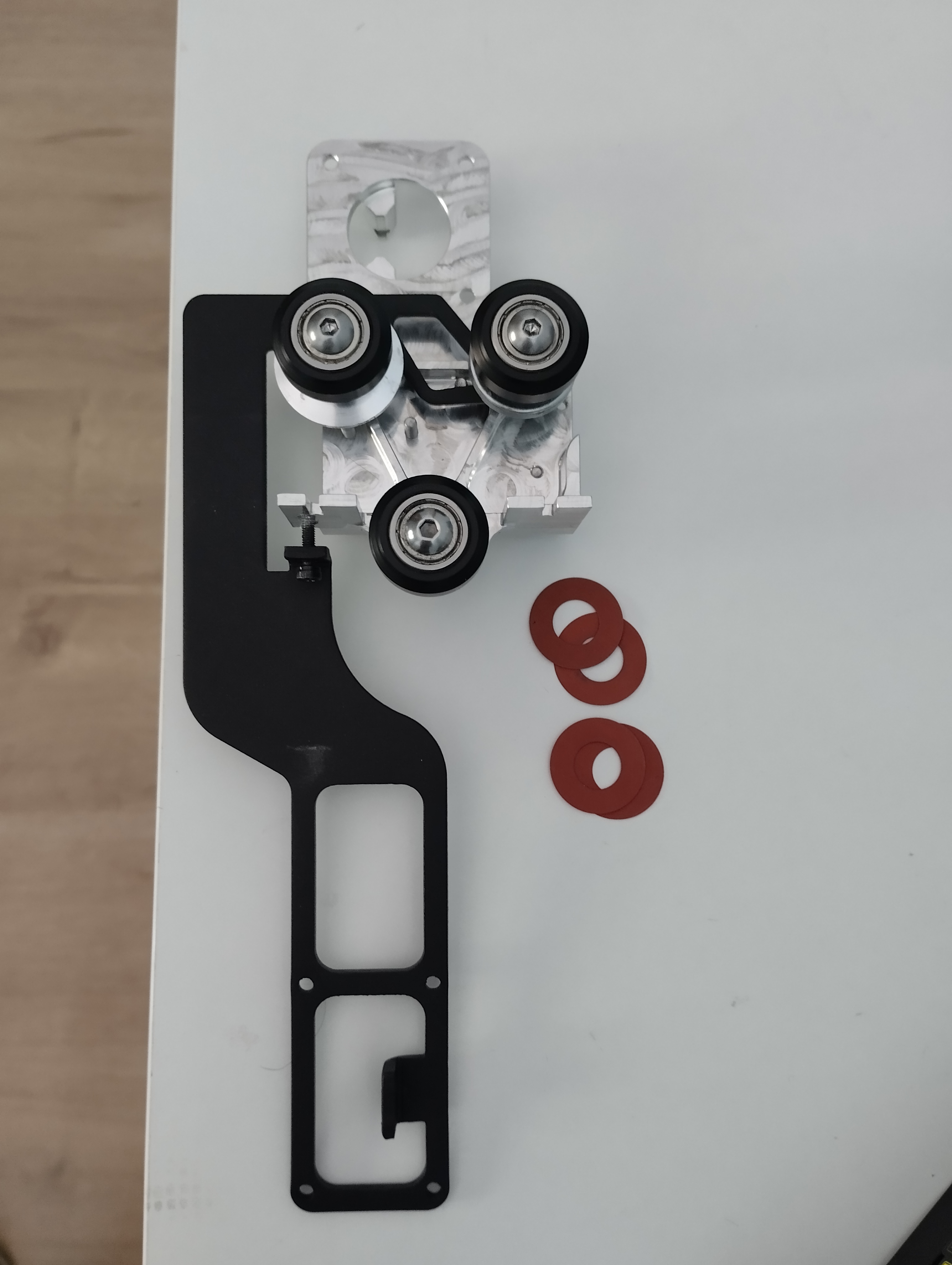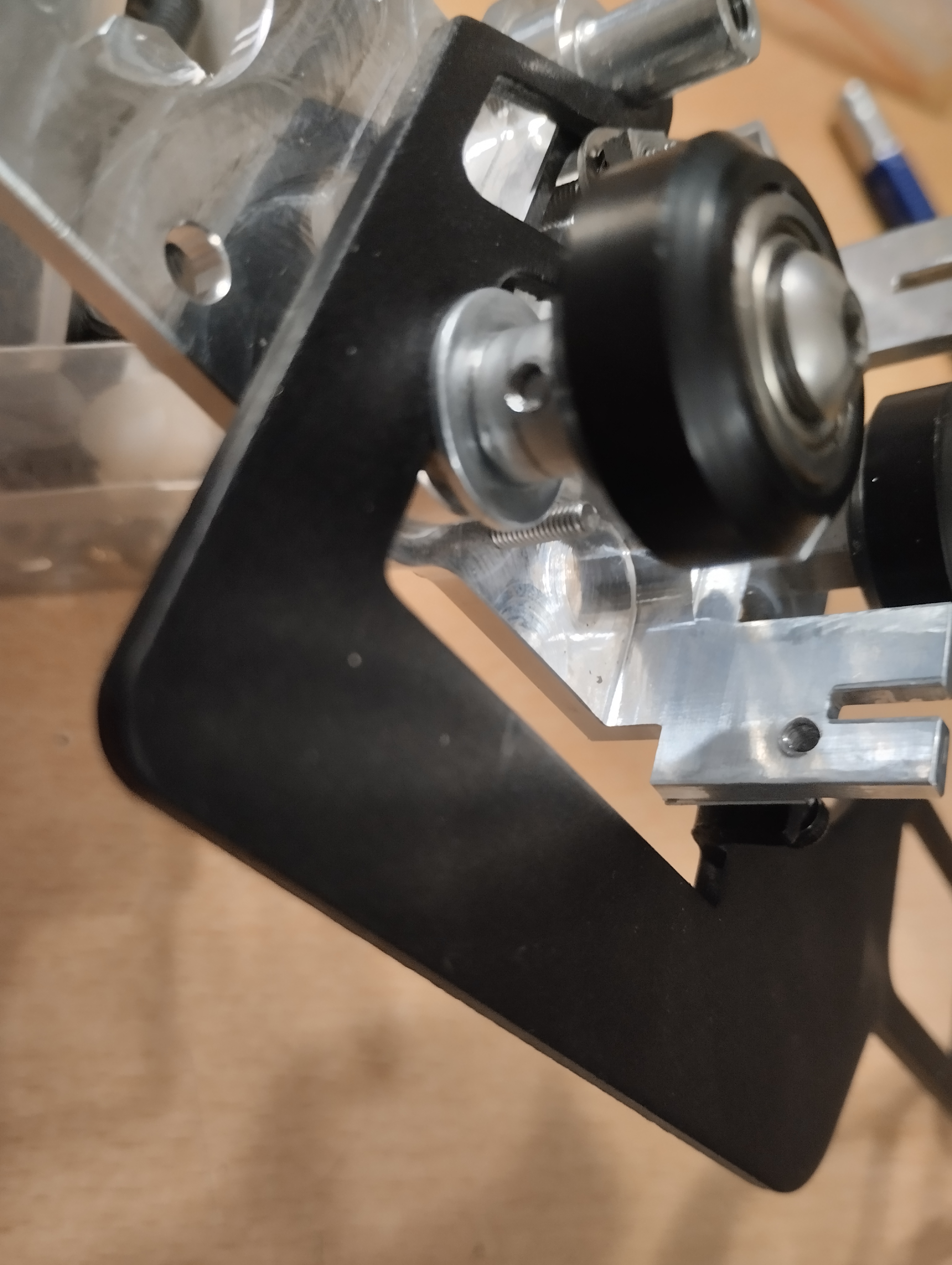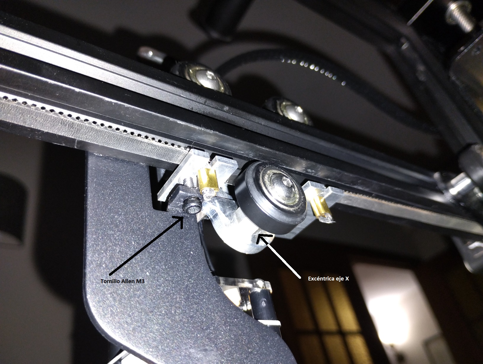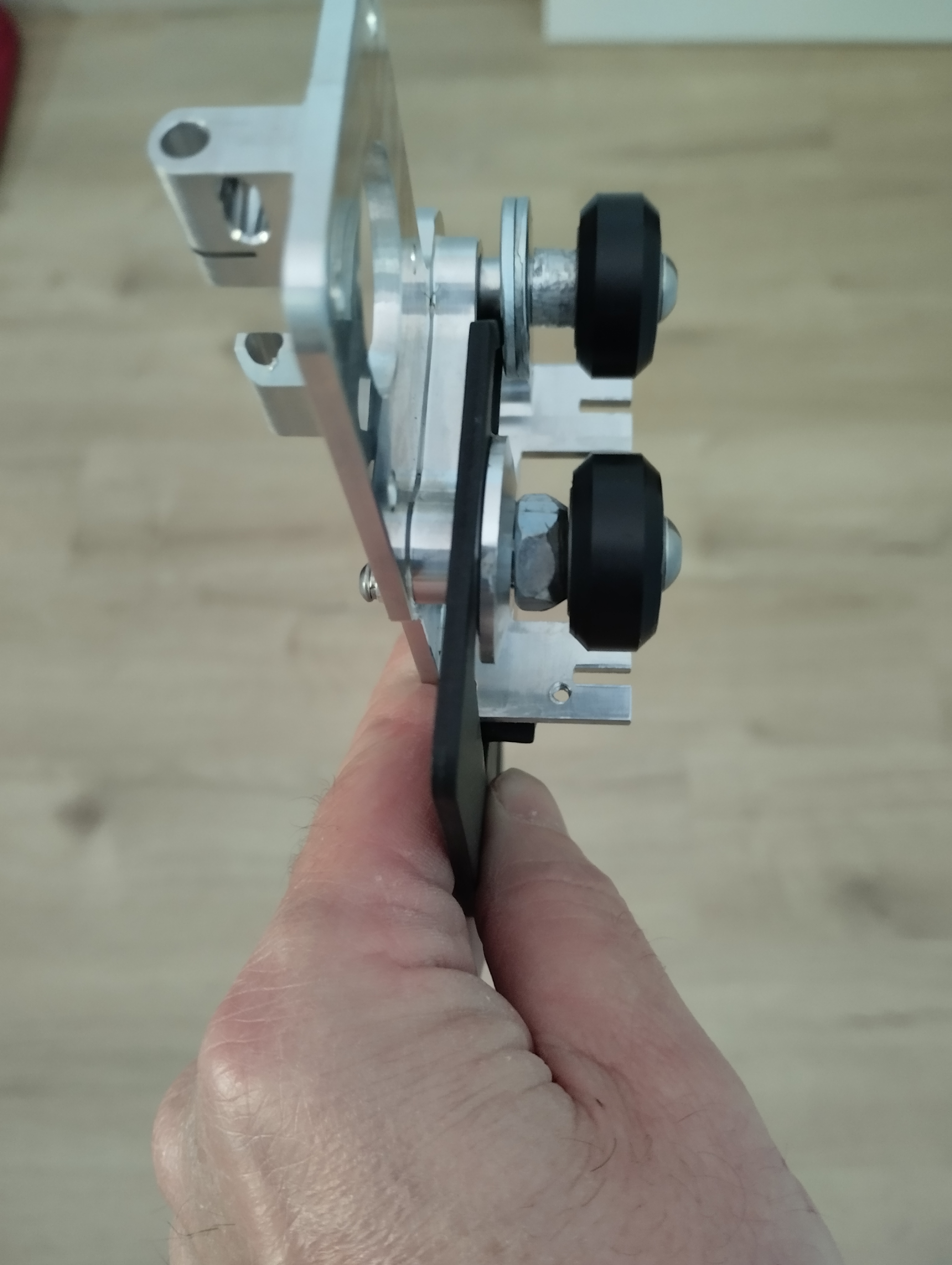 Solo va fijada a la de aluminio por presión de un tornillo M3, nada mas. A lo mejor, las placas originales de aluminio que venían en el kit y que servían entre otras funciones para roscar las ruedecillas, eran mas adecuadas, pero, no las encuentro por ningún sitio. En cualquier caso, la placa negra no podía topar nunca jamás con los perfiles del eje X. Dicho esto, lo mejor a mi entender es que la negra apoye sobre la de Al. Así,