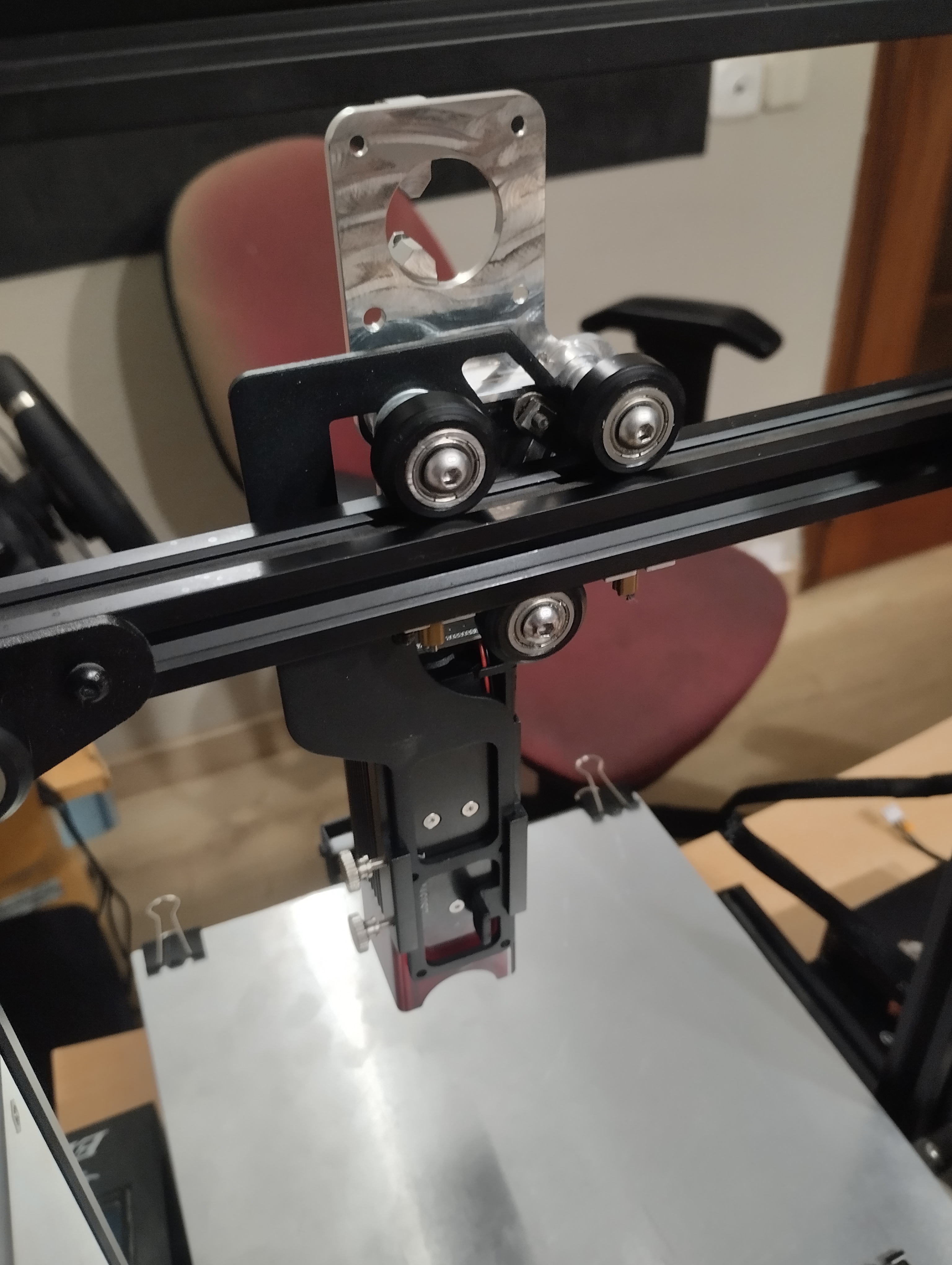 , pero como todas, con todo bien ajustado, ya tengo ejes X e Y bien ajustados, y aún estando bien, el Z es lo de menos, pues al respecto sin problemas. A su vez, viene con extrusión indirecta como es lo normal en esos precios de batalla, si bien yo le puse un buen kit de ext. directa, del cual en las fotos ya solo se ve su placa de Aluminio, porque el resto de componentes ya están a buen recaudo.