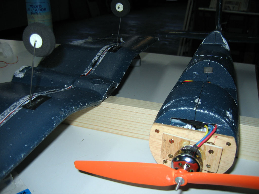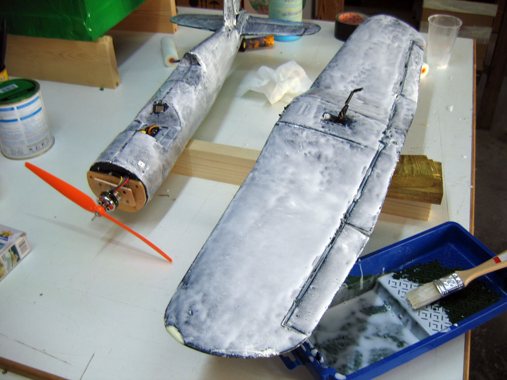 No, este pajaro vuela con el poder del brushless 8) sube en vertical como si nada jeje. He dado la primera capa de cola y la verdad es que esperaba que se distribuyera más uniformemente. Es una autentica pringada la verdad. He podido comprobar el resultado en algunas partes que ya han secado y me temo que tendré que darle 2 capas más por lo menos si quiero que quede decente.