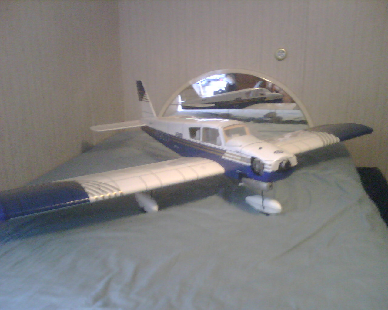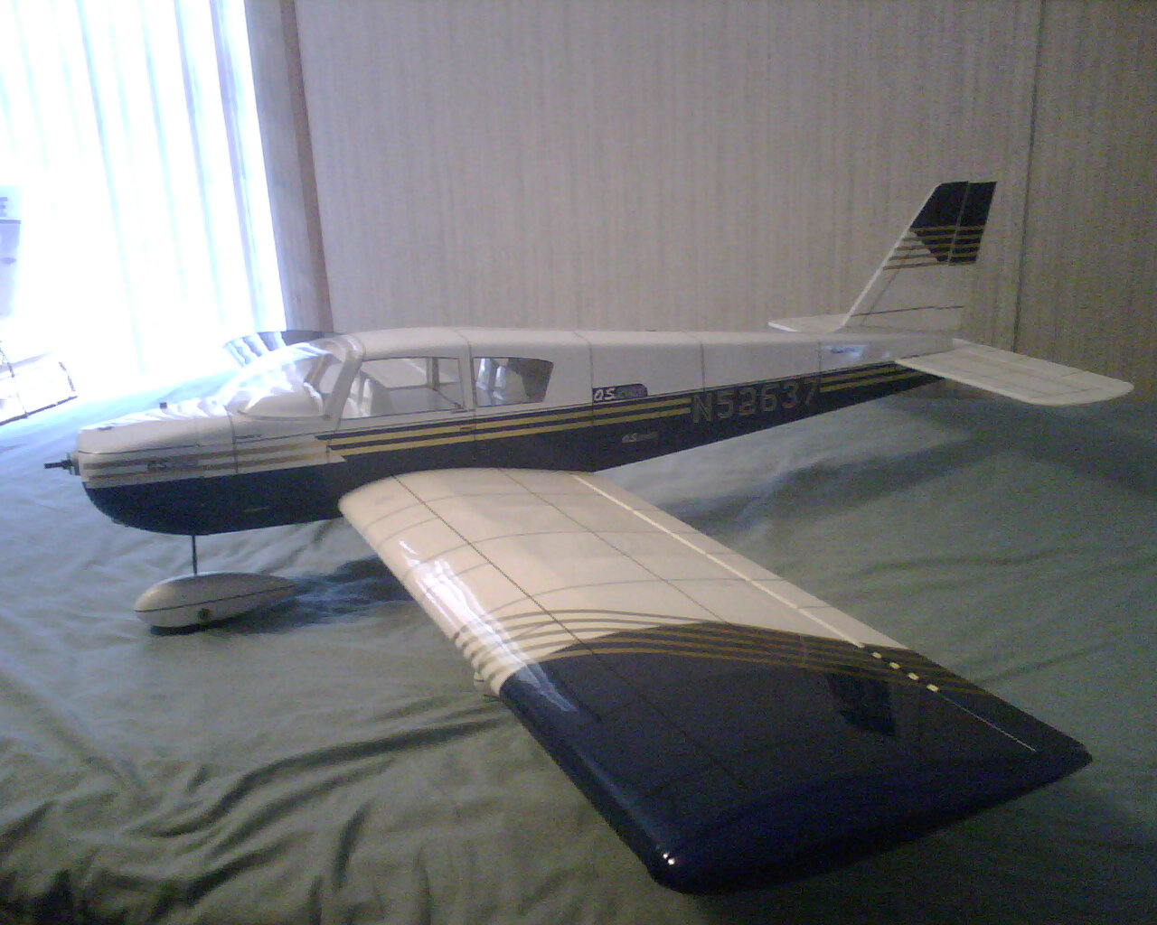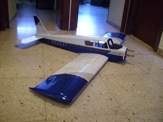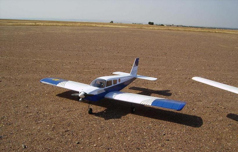 Tras perder mi Magister por fin he conseguido su sustituto: Piper Cherokee de Hangar 9. Pongo unas fotillos para que vean de qué modelo se trata. Tiene aproximadamente 1.5m de envergadura, perfil semisimétrico (espero que se vea en la foto) y un poquillo de diedro; le he montado un Webra .40 aún por rodar. Ya les contaré qué tal va.