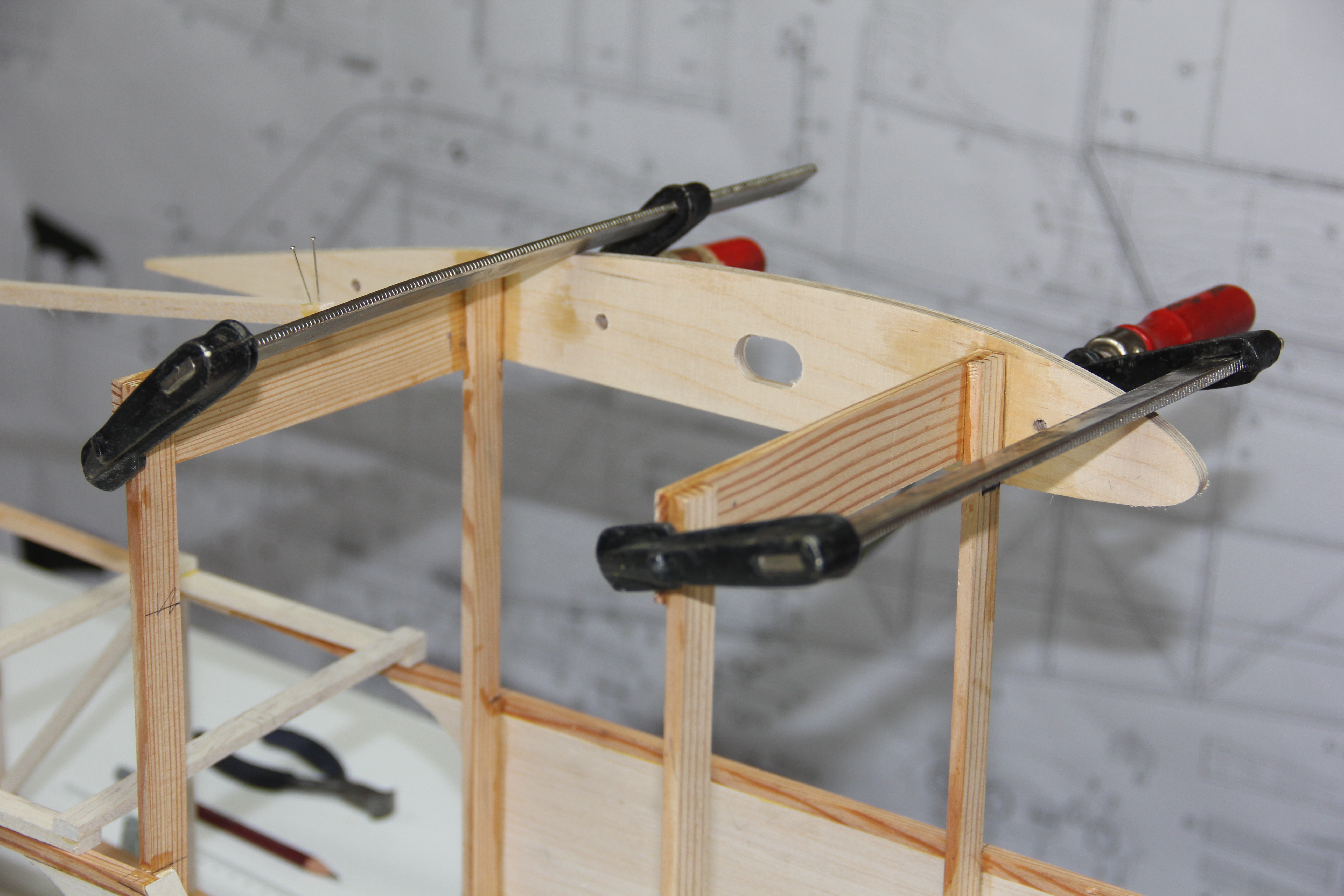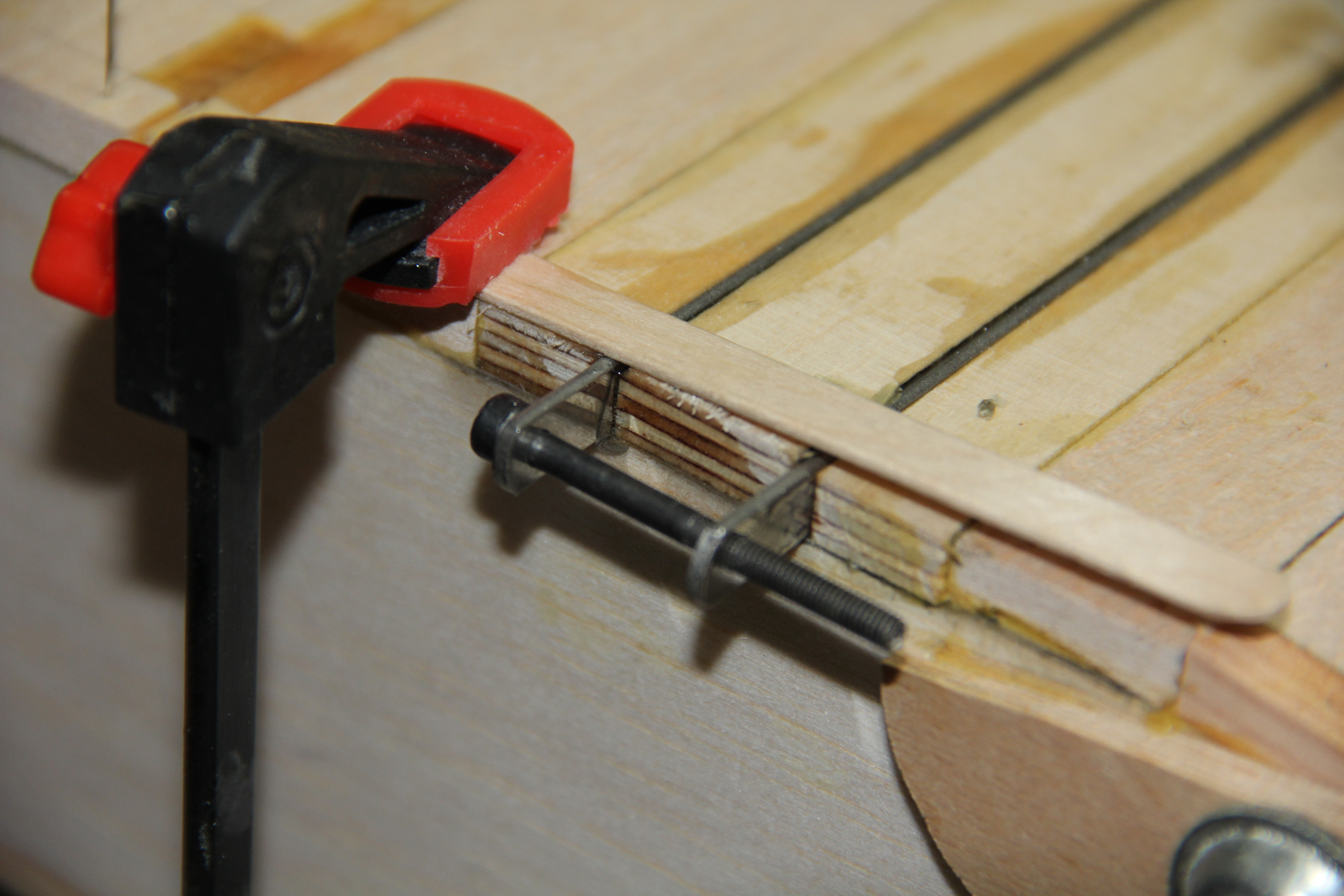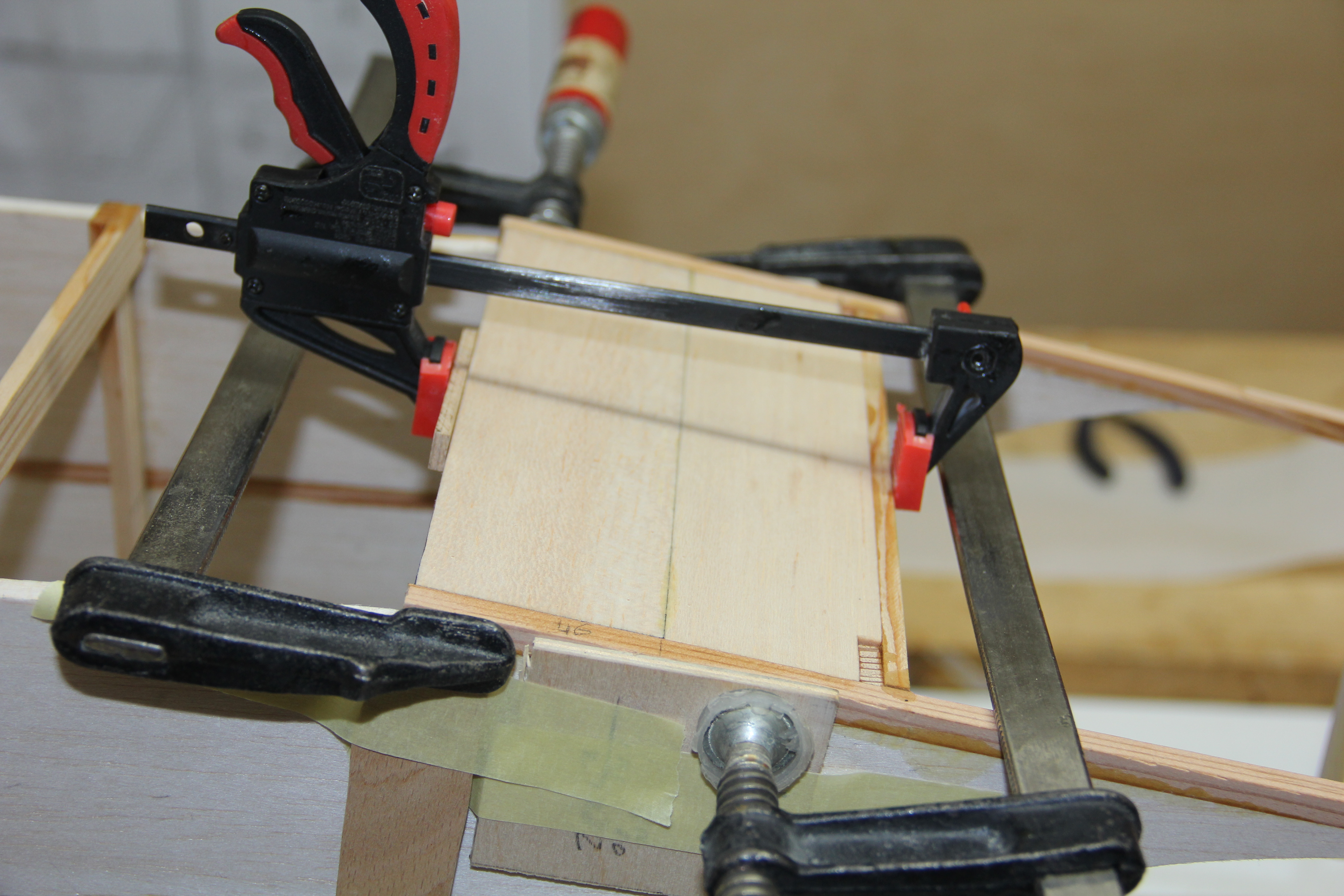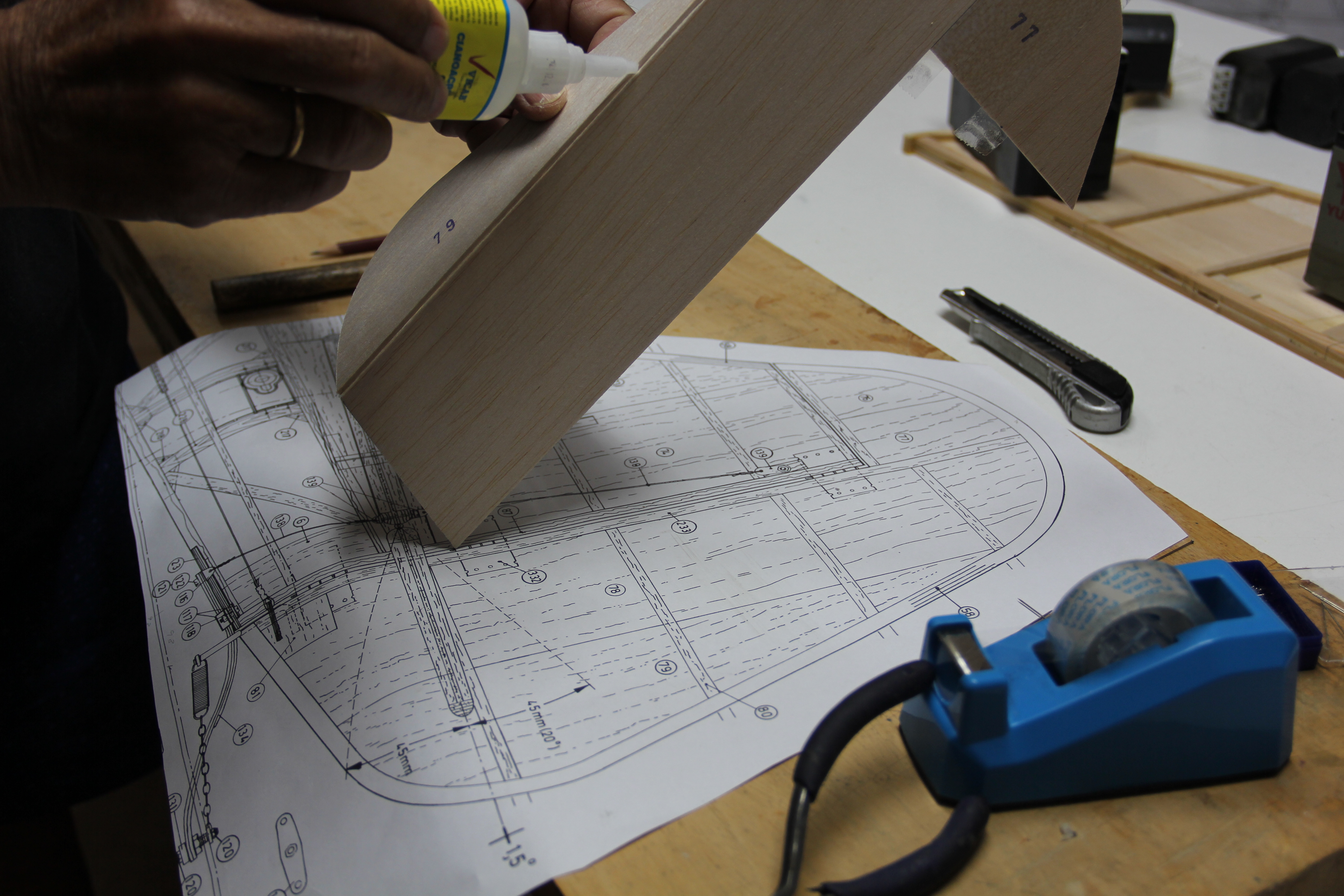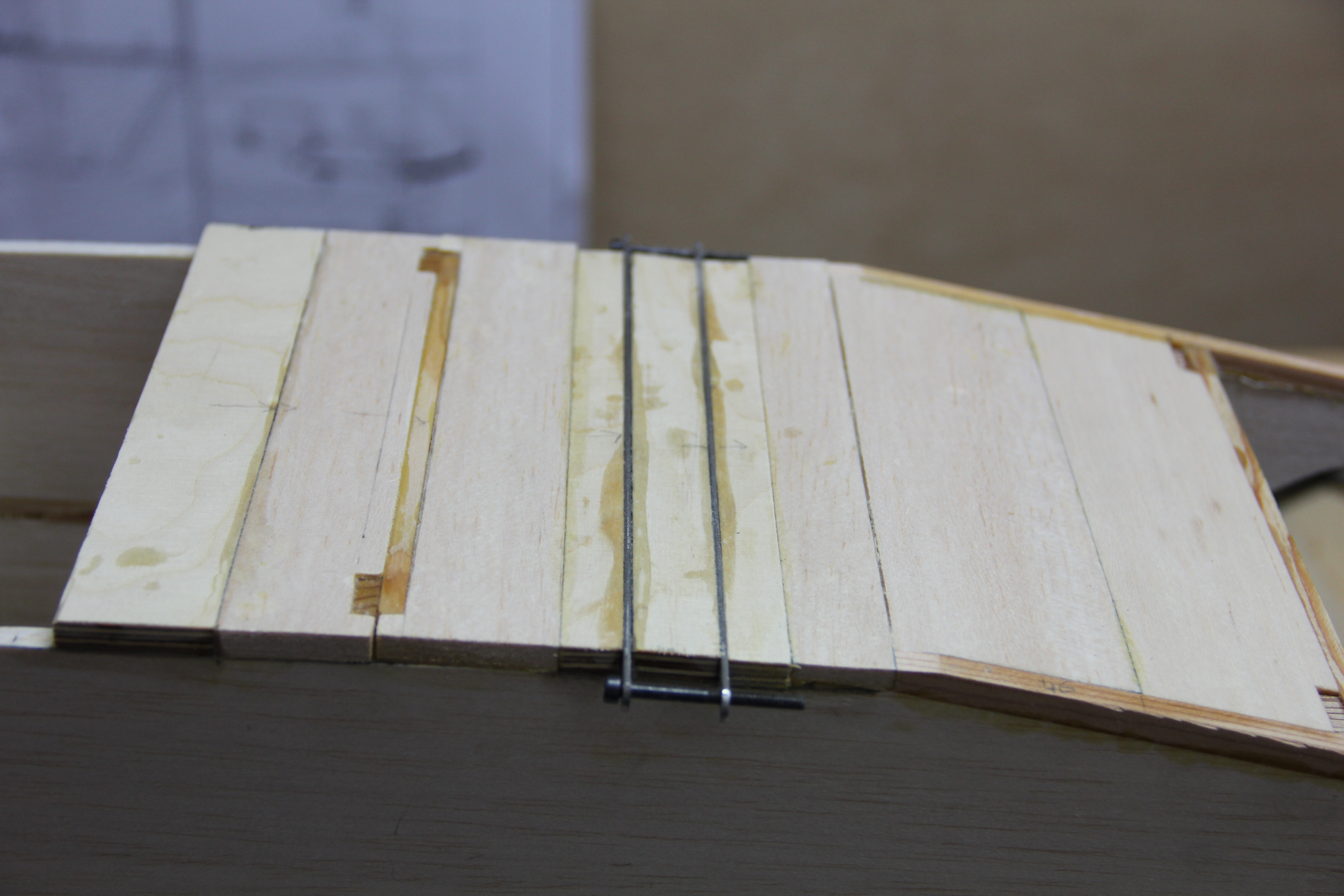 Madera de pino para refuerzos del tren principal y sujección tirantes ala. Colocación