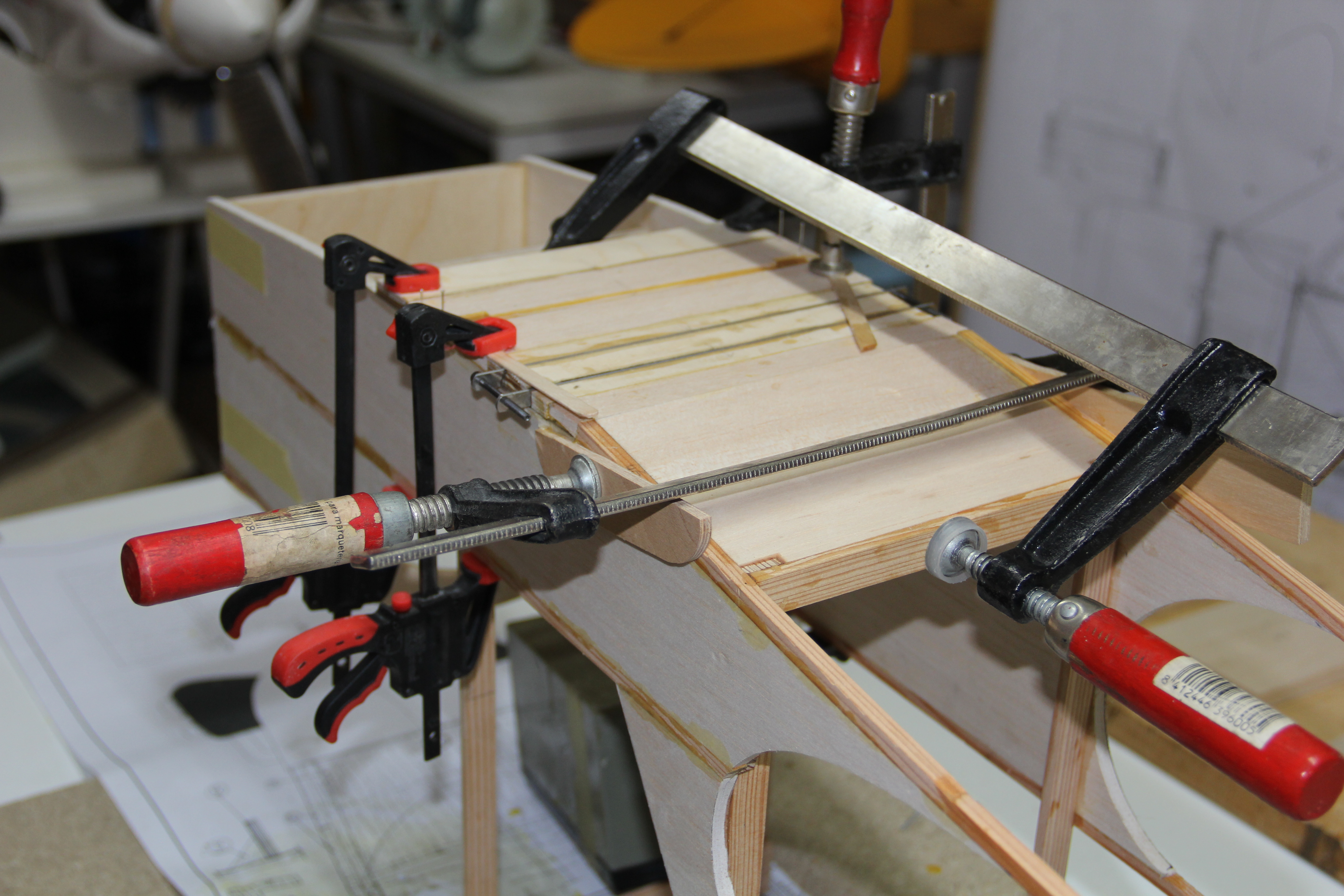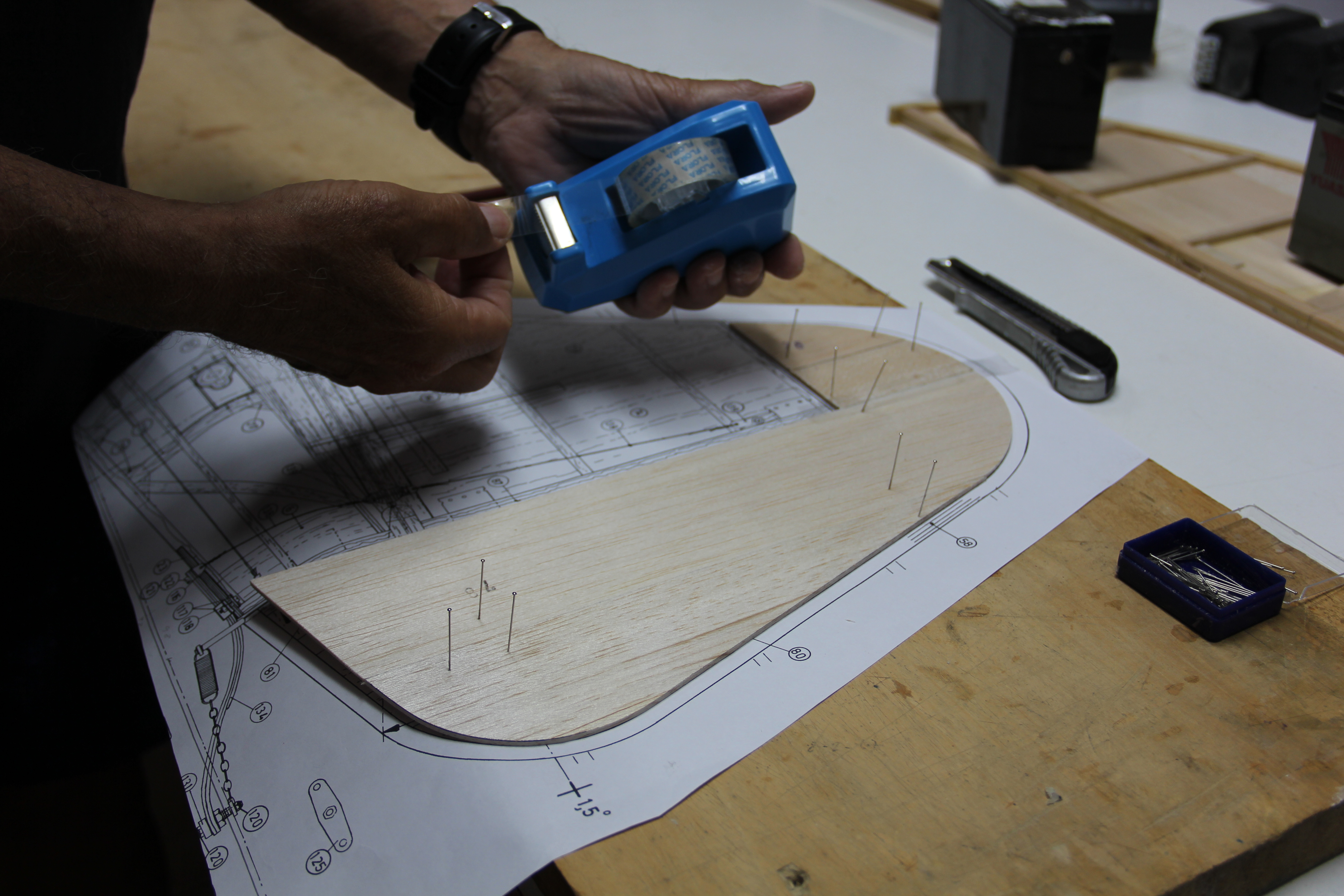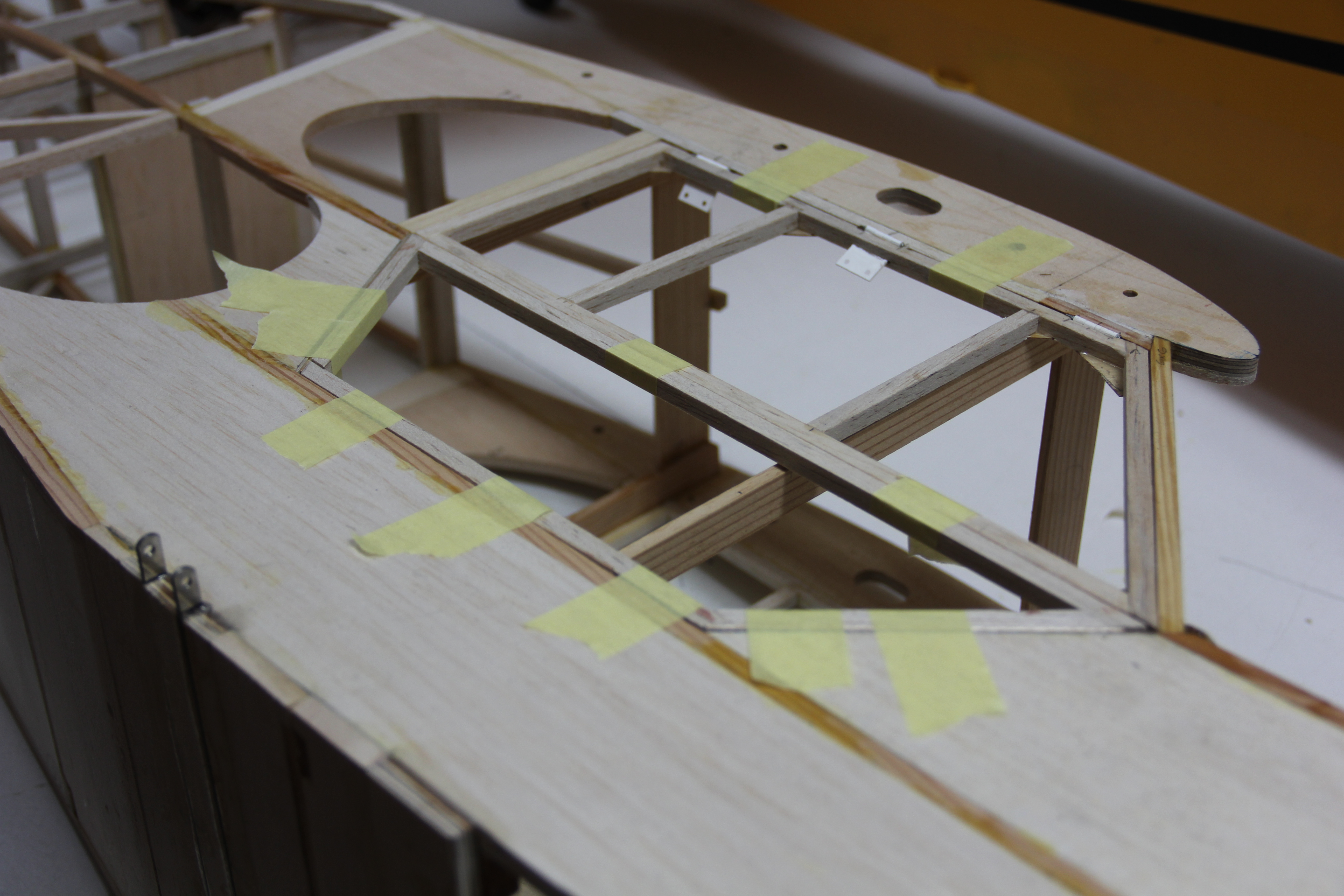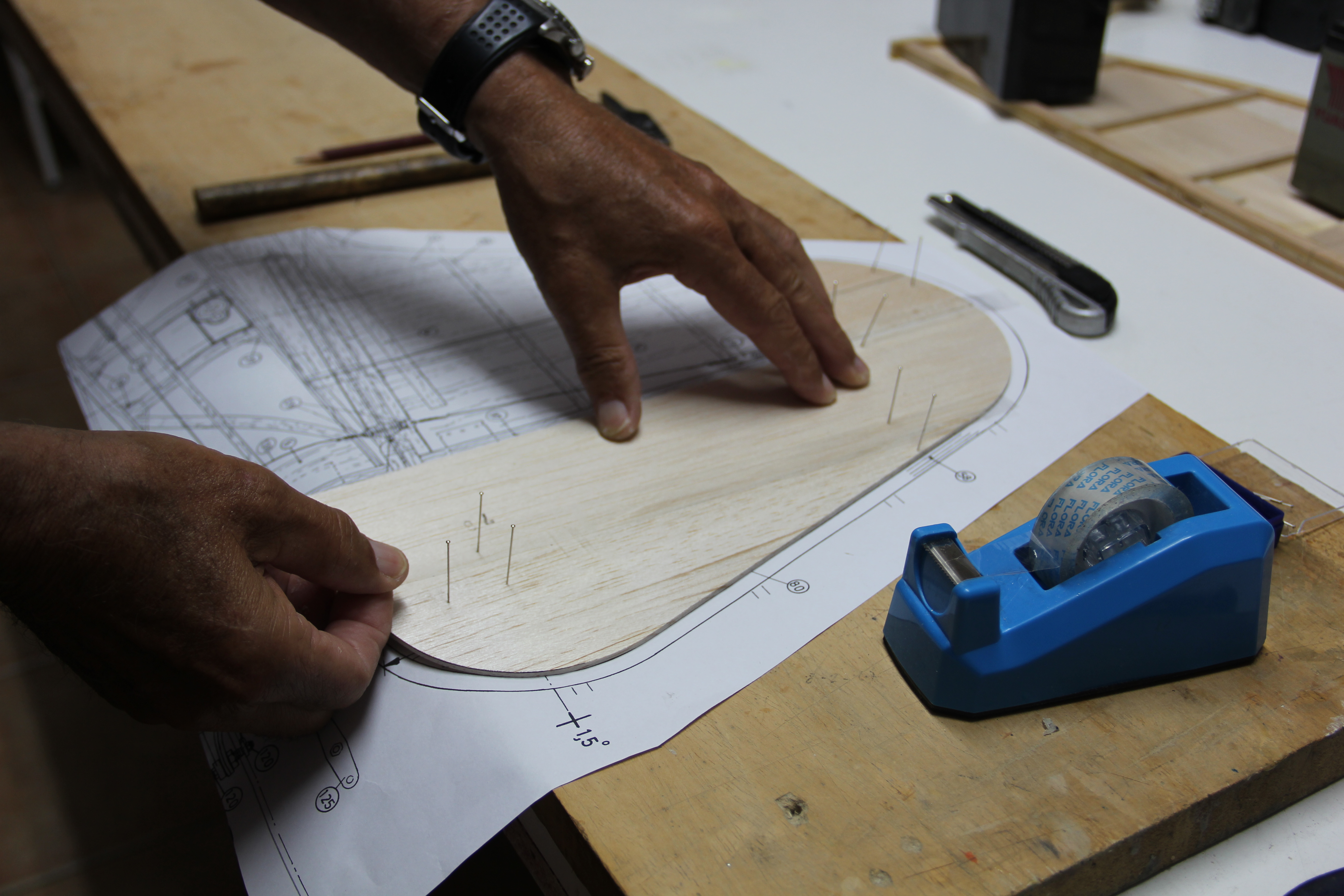 Madera de pino para refuerzos del tren principal y sujección tirantes ala. Colocación