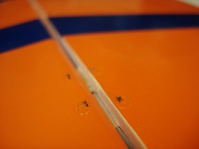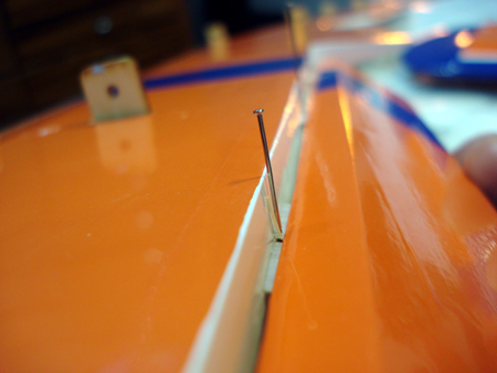 Las bisagras son de fibra y se pegan con cyano muy liquido, me gusta poner una aguja en el centro para que, al unir el alerón al ala, la bisagra siempre quede centrada.