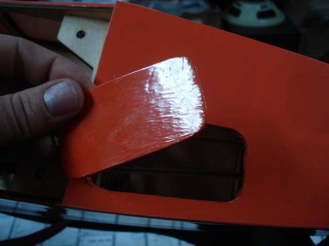 Debido al peso del motor me veo obligado a retrasar todo lo que pueda la posición de la bateria. Esto me obliga a realizar un registro en la panza del avión. De paso me sirve para acceder a la bateria sin tener que desmontar todas las alas (diez tornillos con tuerca) cada vez que vaya a volar. Simplemente retiro el oracover y realizo una tapita con balsa para cerrar el hueco por donde entra la bateria. Esta finalmente va sujeta a una de las cuadernas con bridas de plástico.