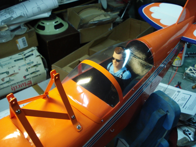 Es el momento de ponerle un bonito piloto, al que he tenido que amputarle parte del abdomen para que su cabeza no tocara con la cabina. El muñeco esta pegado con pistola de silicona, es en este momento cuando coloco también la cabina, con seis tornillos rosca chapa.