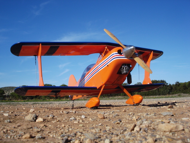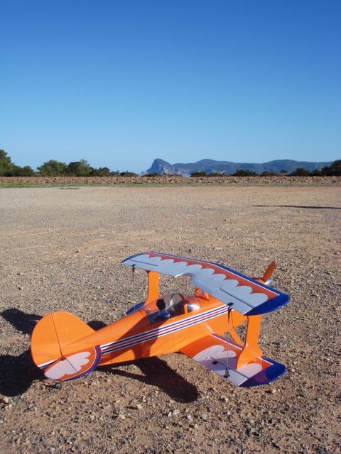 La Pitts ha despegado hoy por primera vez y ha demostrado el por que de su merecida fama. ¡Que caracter!, ha salido un tanto nerviosa con unos recorridos normalitos y su trimado tampoco ha sido muy sencillo, una vez "amaestrada" se ha dejado llevar por los cielos tranquilos hoy lo que me ha permitido comprobar su excelente capacidad de trazada para la acrobacia sencilla, la de toda la vida. Loopings, ochos cubanos, imhelmans..., los realiza con suavidad si utilzo recorridos cortos, si le intento poner algo más de mando (recorridos largos), se convierte en un avión intratable. Por lo tanto ni imaginarse de realizar 3D con semejante avión, por lo menos en este tamaño.