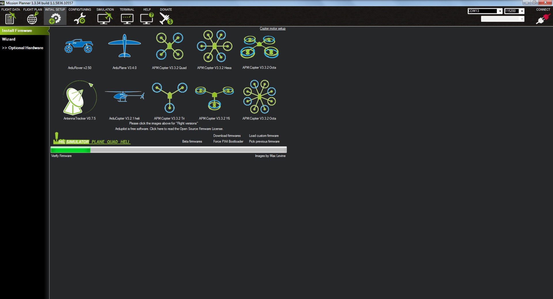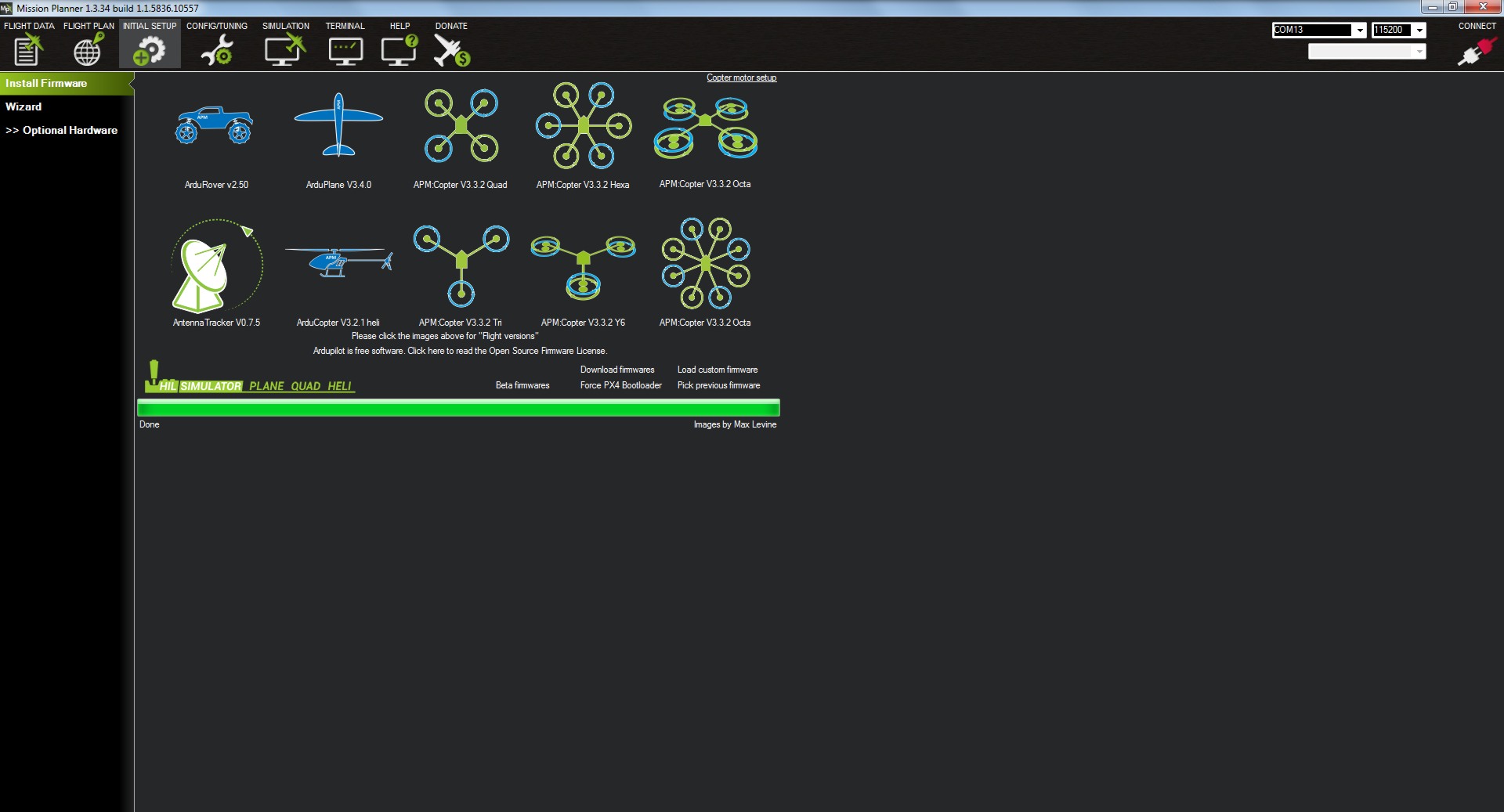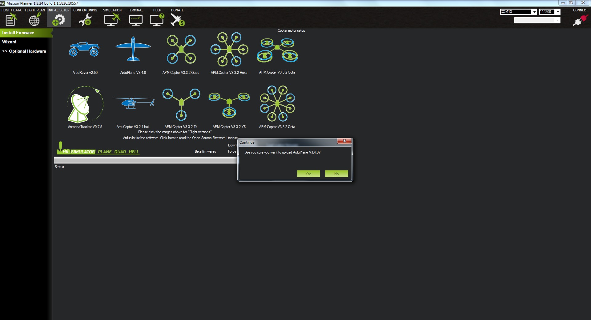 Una vez abierto el Missión Planner y conectada nuestra placa nos iremos al menú de INITIAL SETUP.