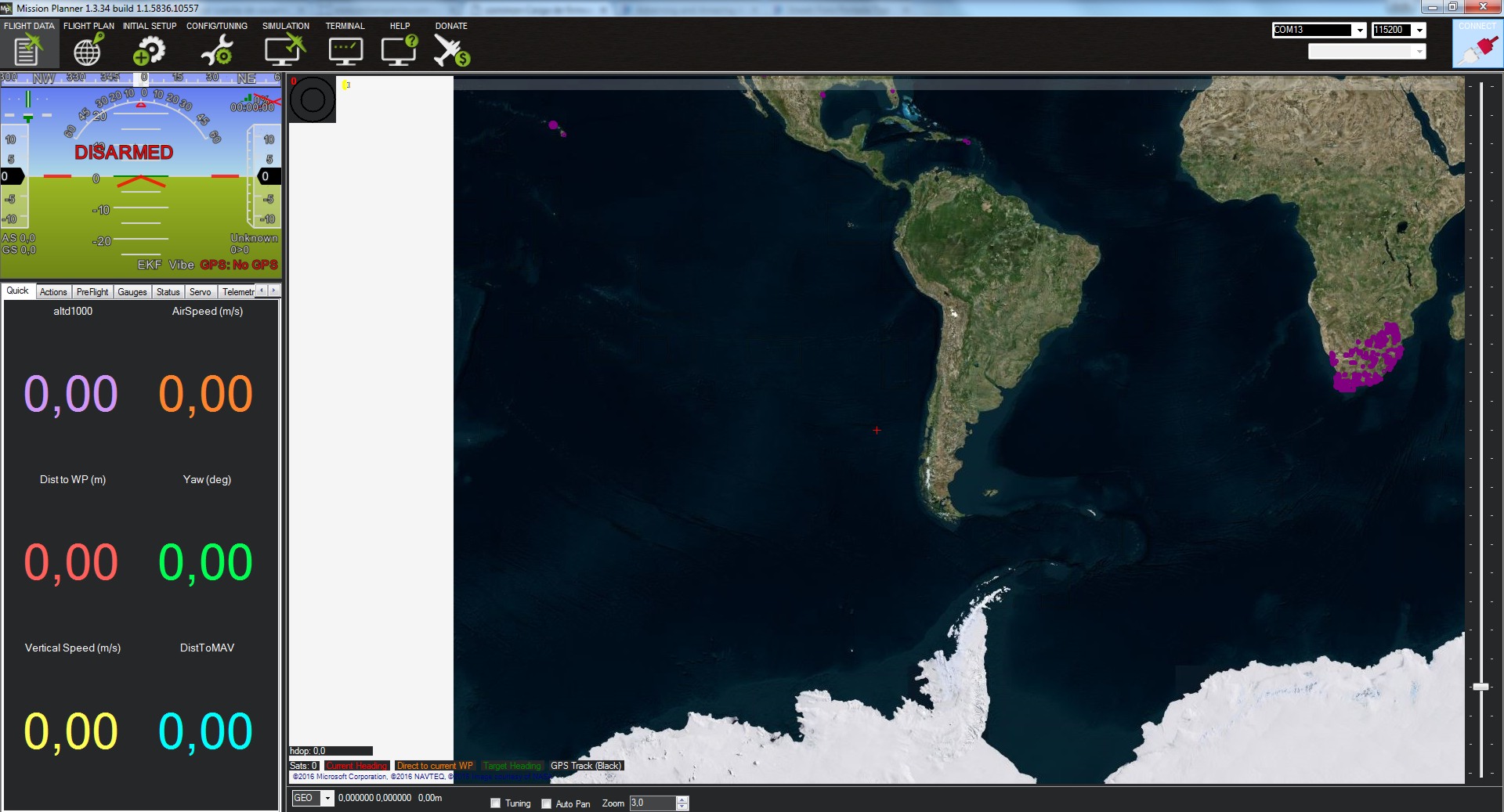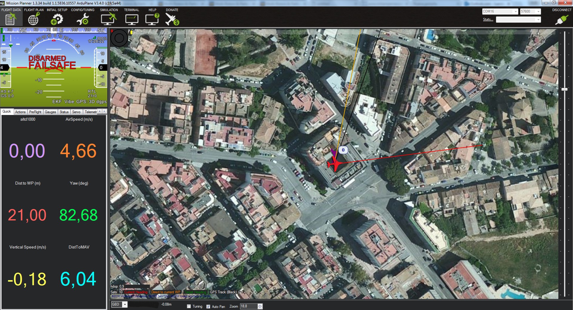 Comprobamos en la pantalla FLIGHT DATA que el vector "Current Heading" marca la posición real del avión.