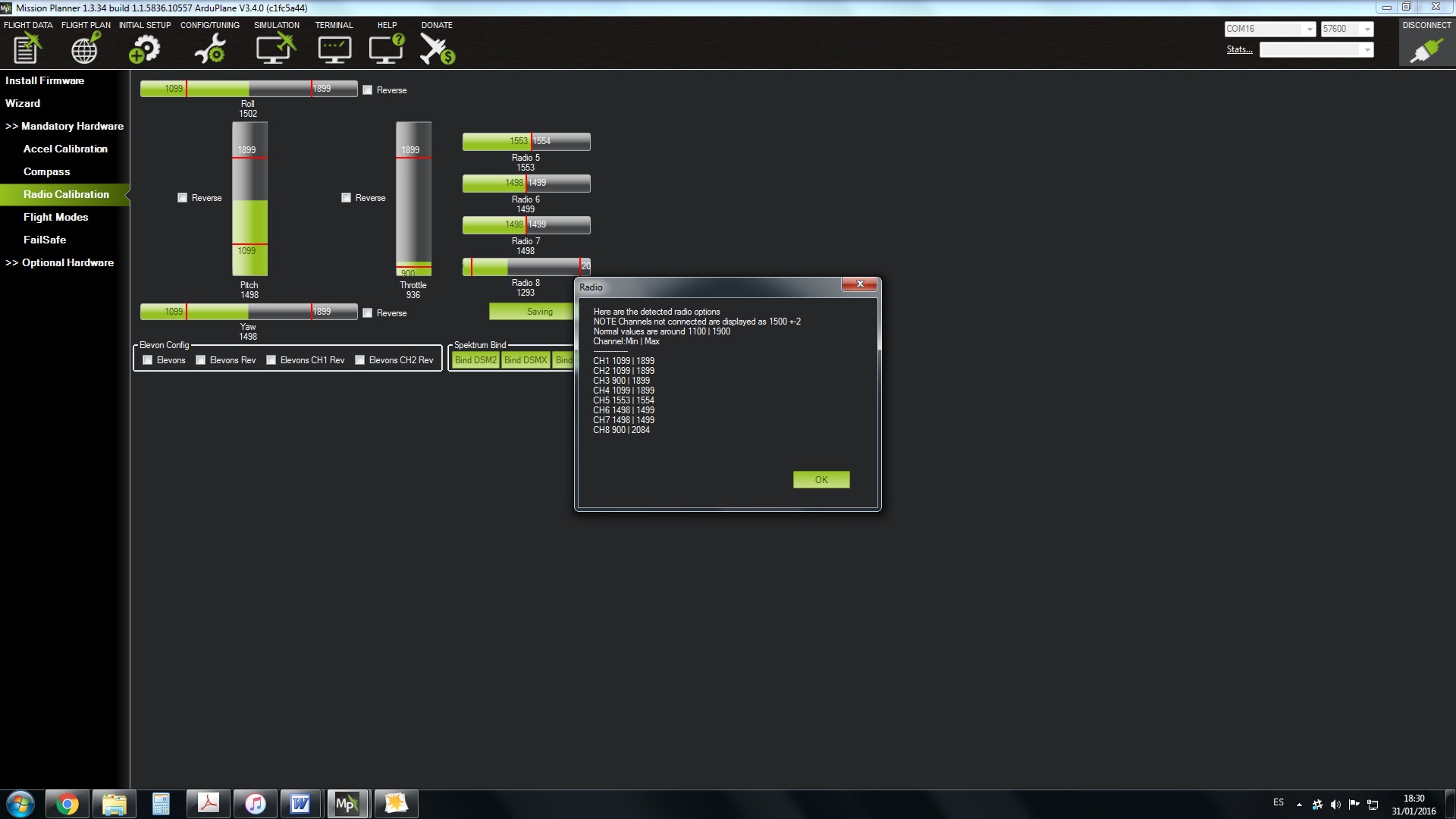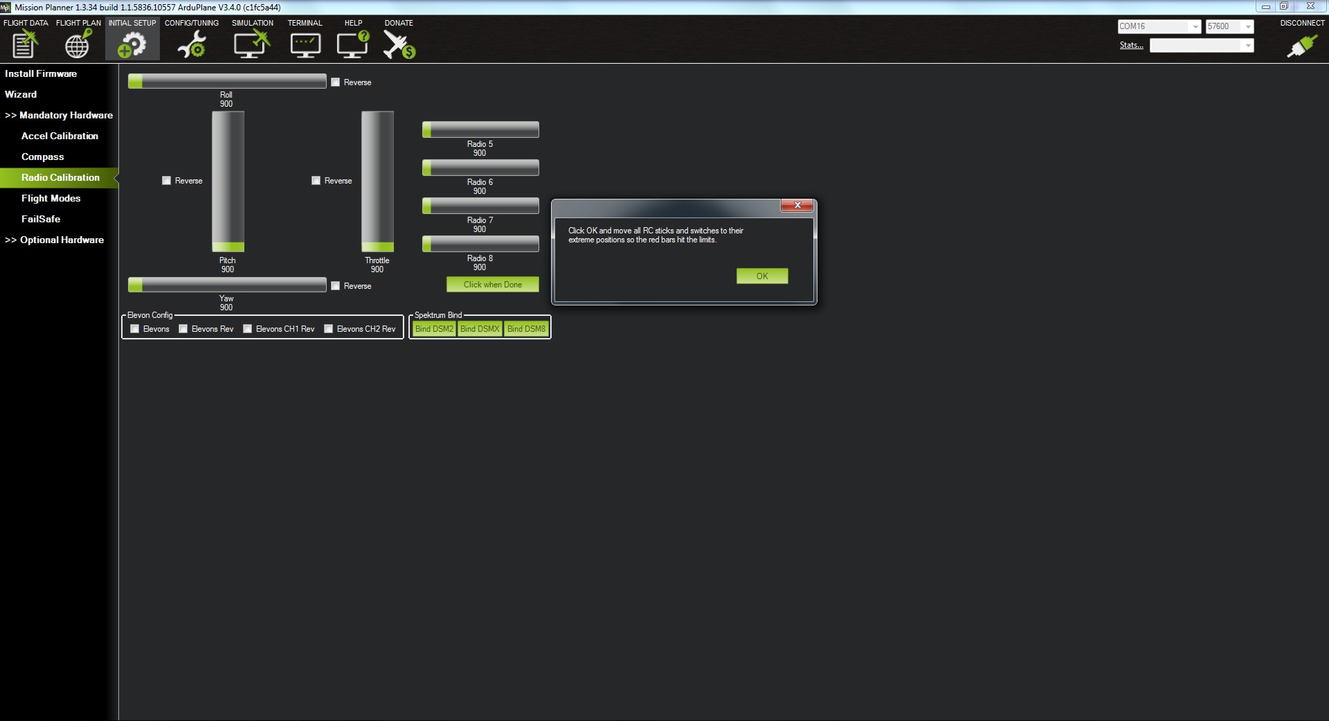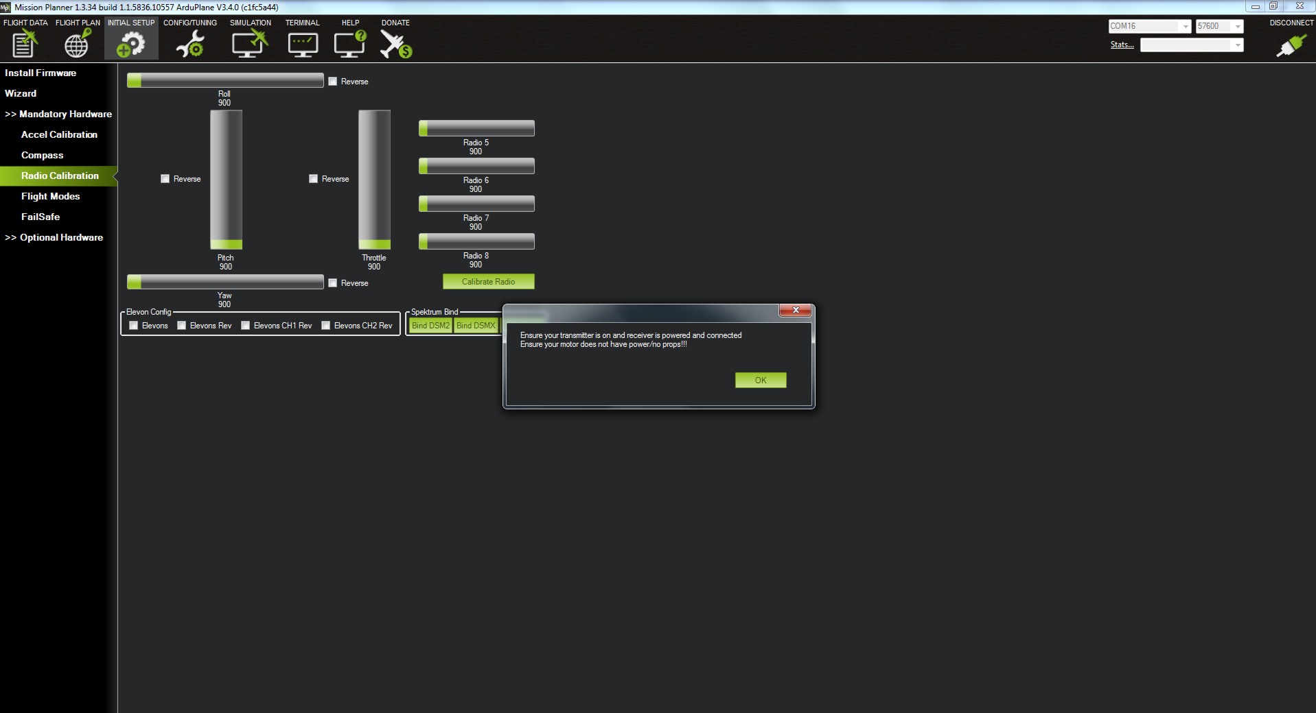 Nos aparece un mensaje informativo para asegurarnos que nuestra emisora y receptor están alimentados y conectados; y que el motor no esta conectado o no tiene hélice. Pulsamos OK si se cumple lo anterior.