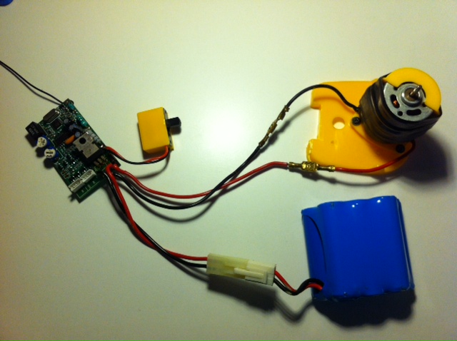 El otro conector del ESC debe ir al receptor, al canal de gas, pero si el receptor tiene integrado el controlador para el motor, lo veo dificil de conectar. Habría que sacar el canal de gases en el receptor (si se puede).