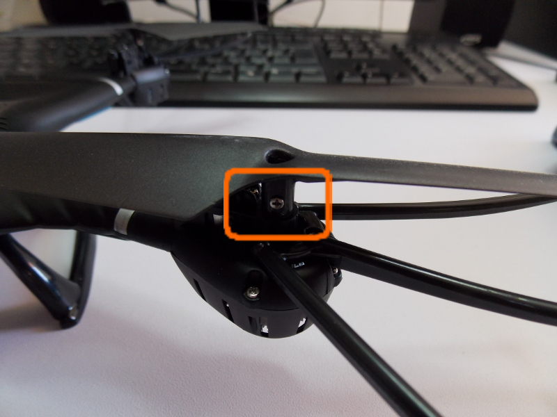 En el cuerpo del dron colocamos los protectores de hélices asegurándolos con un tornillo. Hay que encajarlos adecuadamente para asentarlos en sus alojamientos.