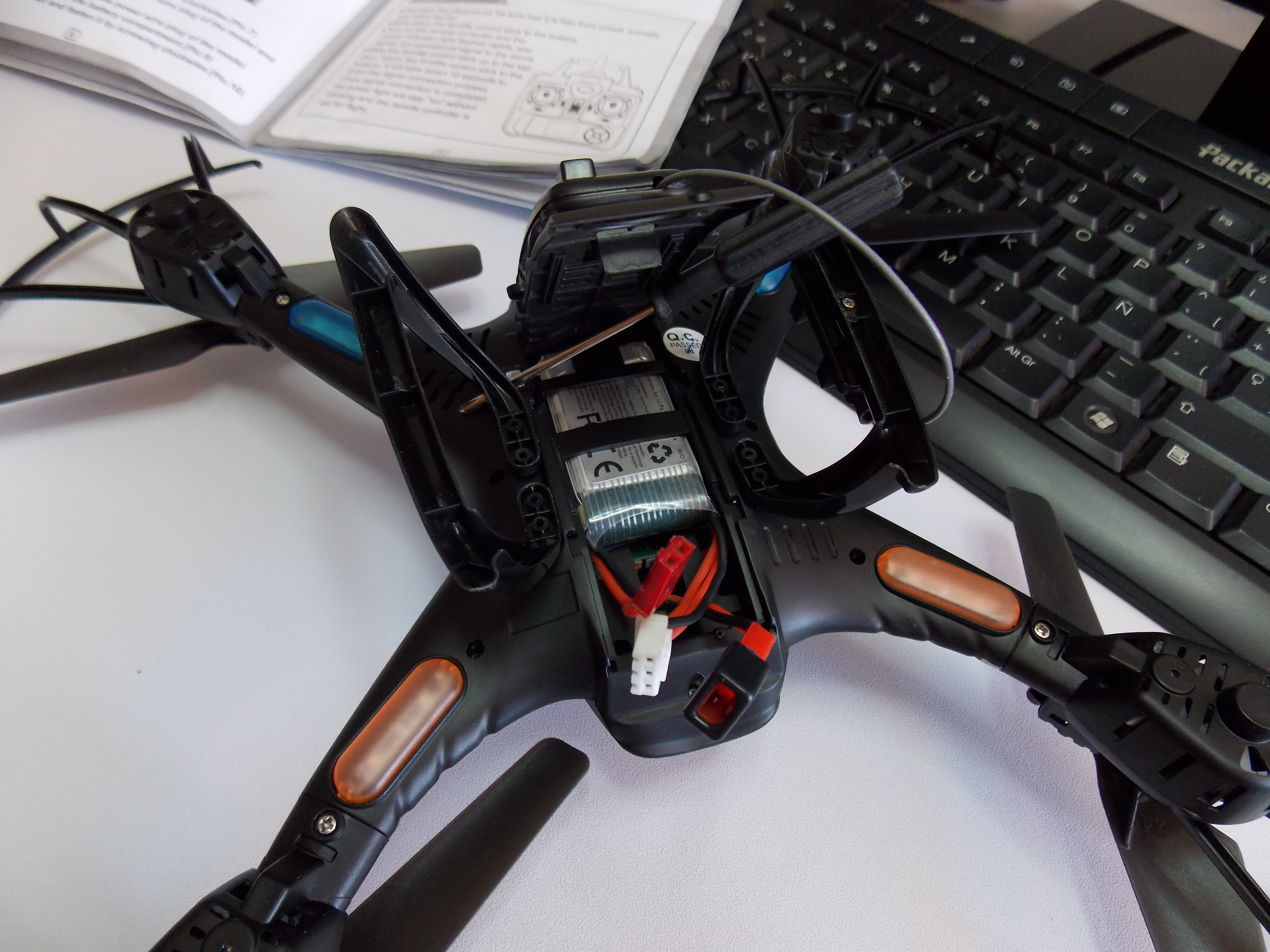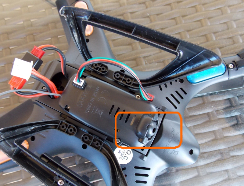 Conectaremos el cable que une cámara y la electrónica interior del dron.