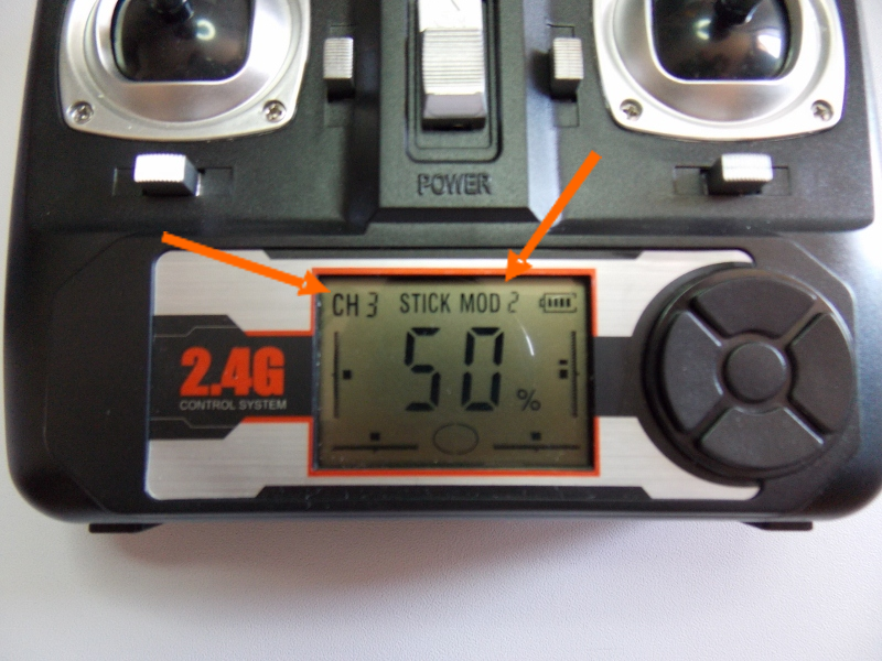 Con el botón gris más exterior (3) del lado derecho del emisor podemos optar por mayor potencia y velocidad de vuelo. Queda representado en el display del emisor mediante un relleno parcial en la circunferencia inferior.