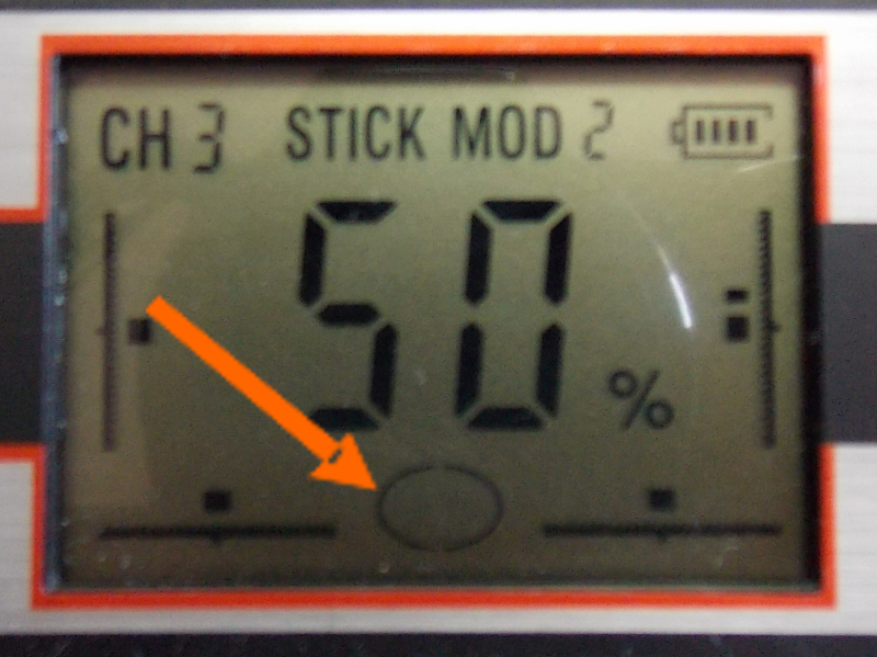 Aprovechando la foto, comentamos que el 50% que figura, corresponde al stick del canal que por último hayamos movido. Este canal se indica arriba a la izquierda. Es conveniente comprobar que los cuatro canales estén al 50% mediante los trims, éstos son de pulsación y precisos.