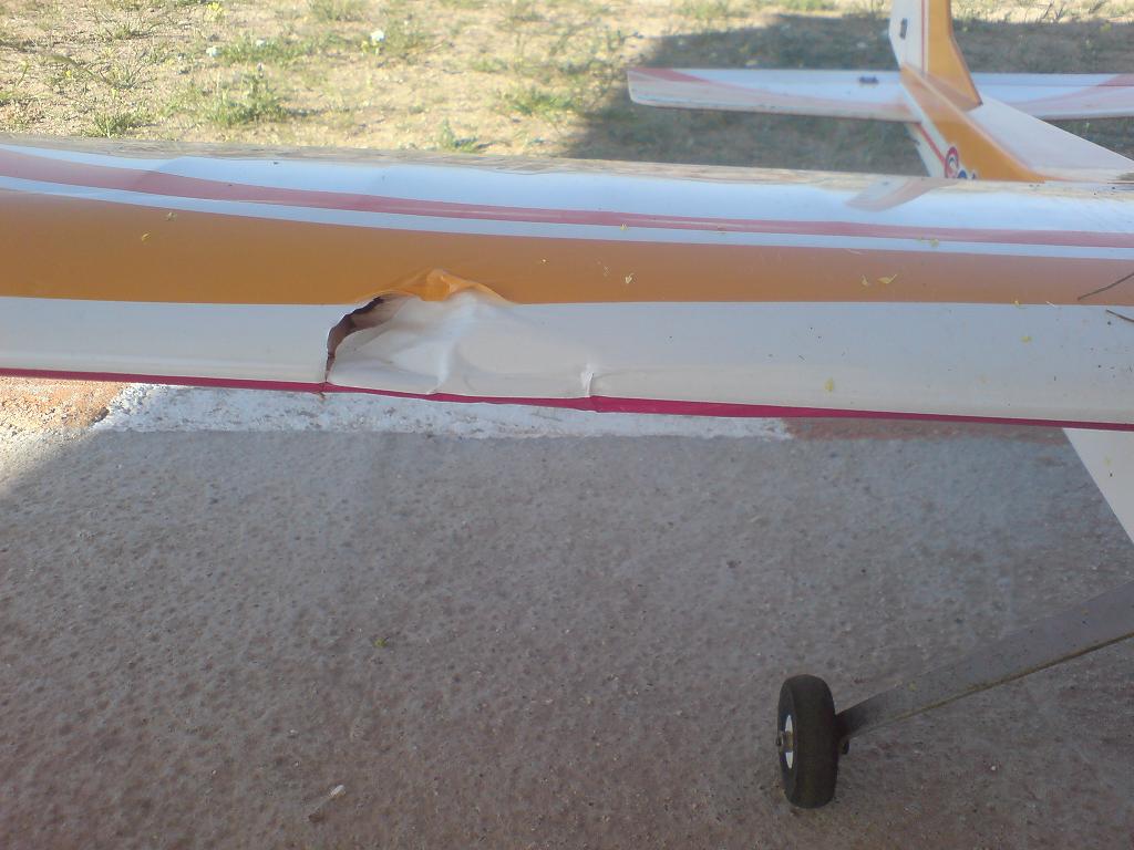 los daños han sido la elice, un gran boquete en el borde de ataque que solo a afectatado un poco a una costilla y al enchapado... Solo eso y se ha pegado una buena torta... por ahora le doy un 9 a la resistencia de este modelo