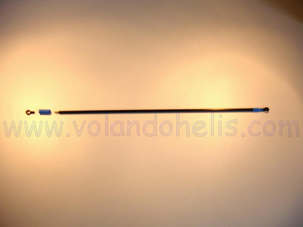 Compra una varilla hueca de carbono de 3 mm, córtala un poco mas corta que la propia varilla metalica e introduce esta dentro de forma que sobresalga la rosca por los extremos. Echale un poco de cyanocrilato antes de meterla para que quede como si fuera de una pieza y finalmente la sellas con termoretractil en los extremos.