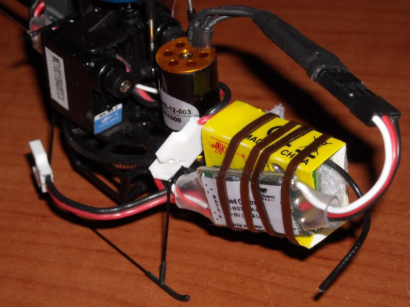 Primero que nada descartar que efectivamente no este un eje torcido o algun otro problema mecanico que cause dicha vibracion. El fallo lo provoca el modulo Receptor-Gyro-Mixer del heli (cajita amarilla) que al parecer necesita algo de presion por los costados para funcionar correctamente. Lo que hice fue poner el Speed Control del rotor principal por un costado y una esponja o hule (que se usa para empacar) por el otro costado, después apretar todo el conjunto con gomas de hule para que hagan presion sobre la caja amarilla.
