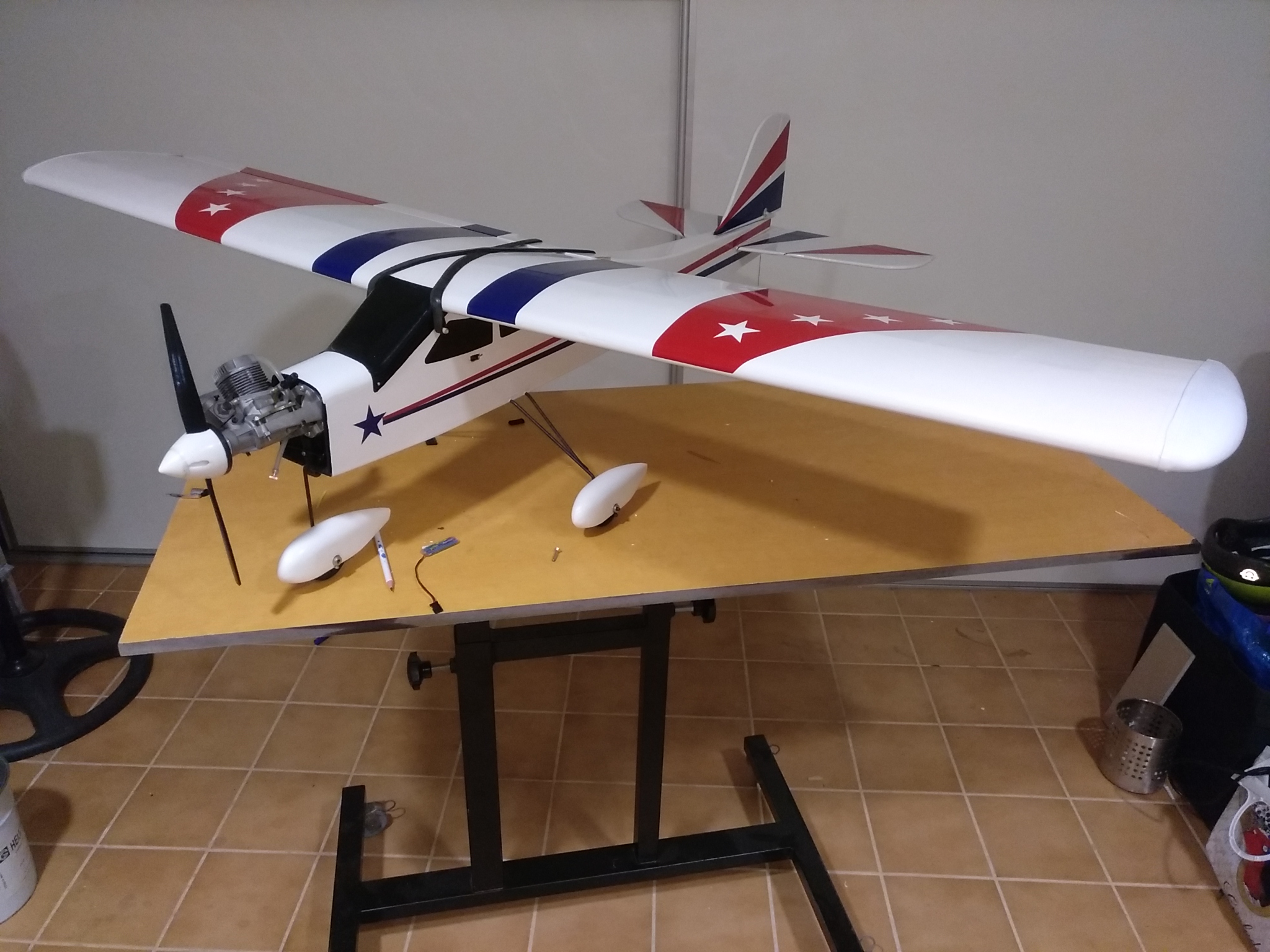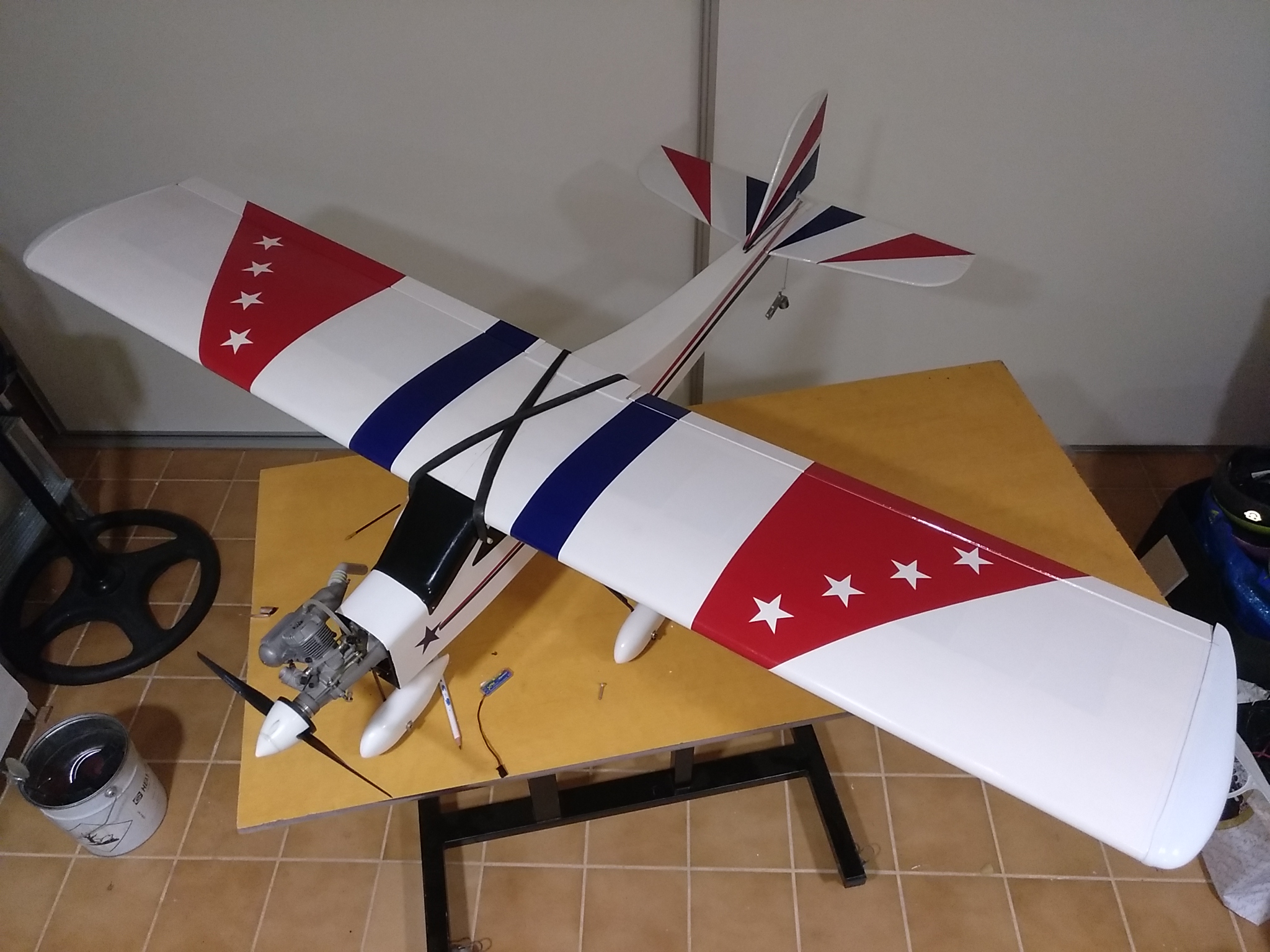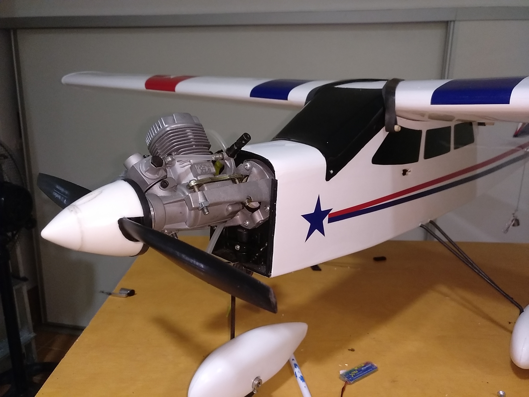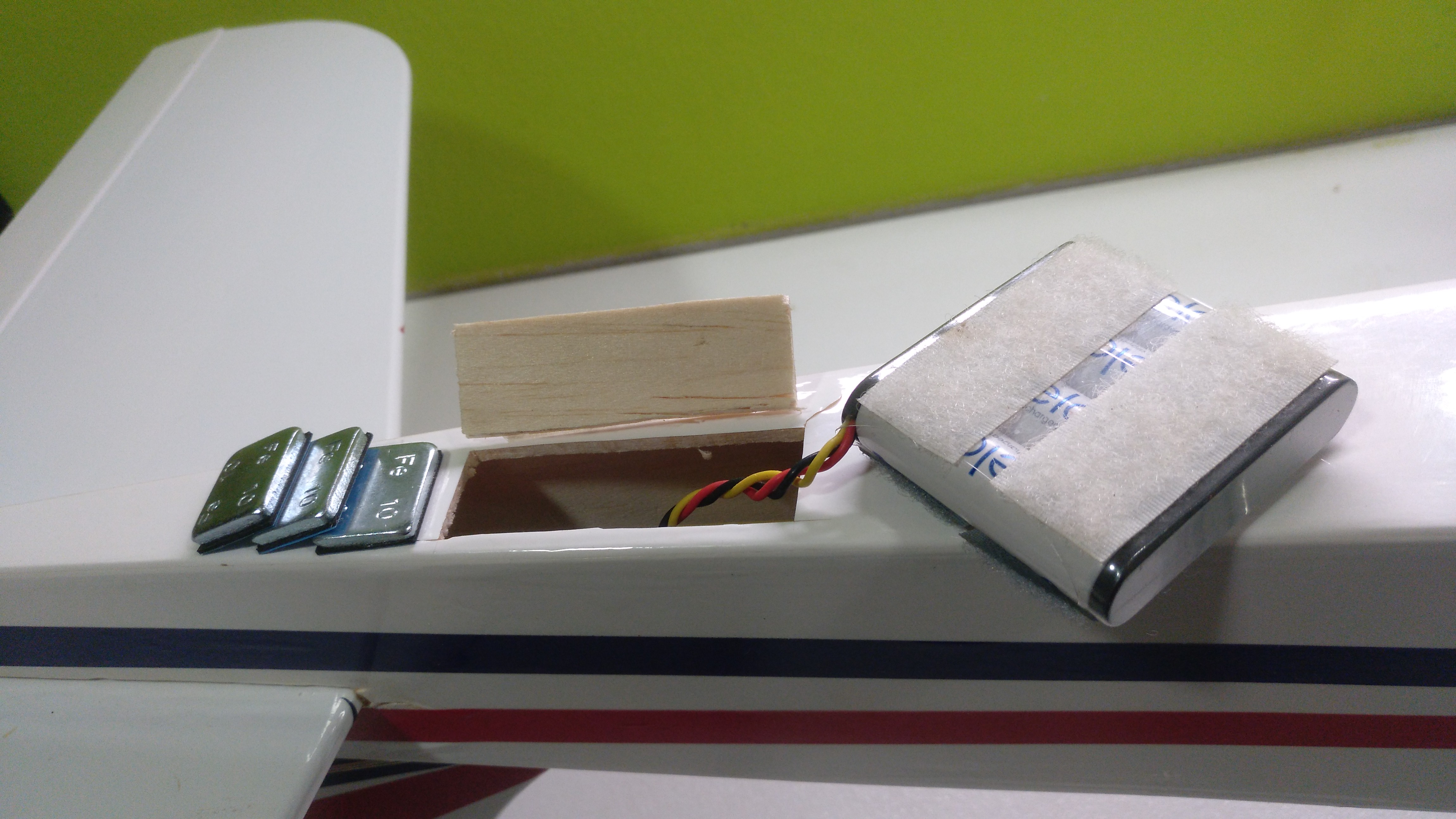 Os cuento. He comprado a un amigo un avión entrenador nuevo sin estrenar y lo acabo de montar. Todo listo. Pues me dispongo a buscarle el centro de gravedad y me veo que cae de morros pero una barbaridad. He atrasado las baterías hasta topar con la cola por el interior y aún así me pide más peso para estabilizar el avión, para que quede horizontal. No me gustaría cargarle más peso porque tendría que meterle 15 o 20 gramos más, por lo menos.