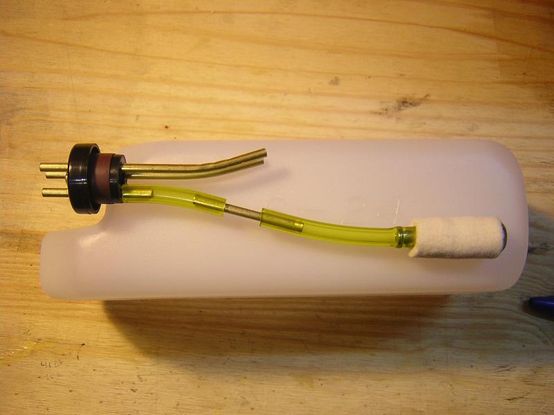 Pero sigo sin saber que hacer con el tubo que me sobra. Como he dicho llevo una valvula de llenado Du-Bro, por lo tanto solo utilizo una salida del deposito hacia la valvula y de ahí va al carburador,la segunda salida del deposito la voy a utilizar como respiradero. En la punta le pondré un pequeño filtro mejor que un tornillo como tapón. Pero que hago con la tercera salida del deposito??? La anulo???