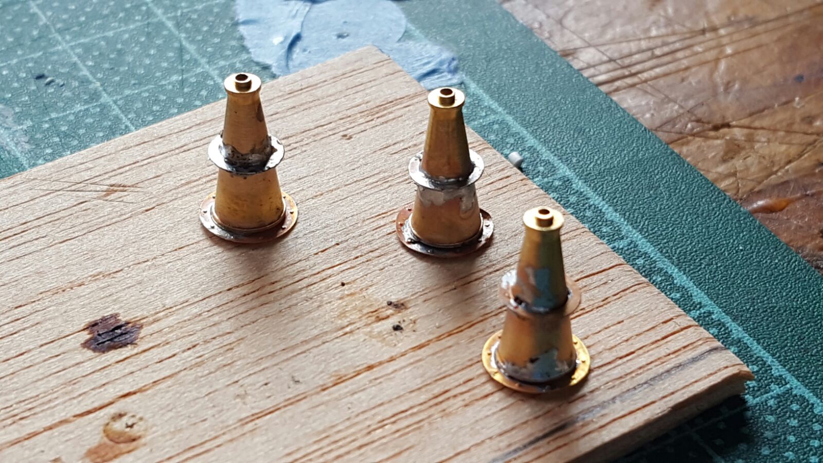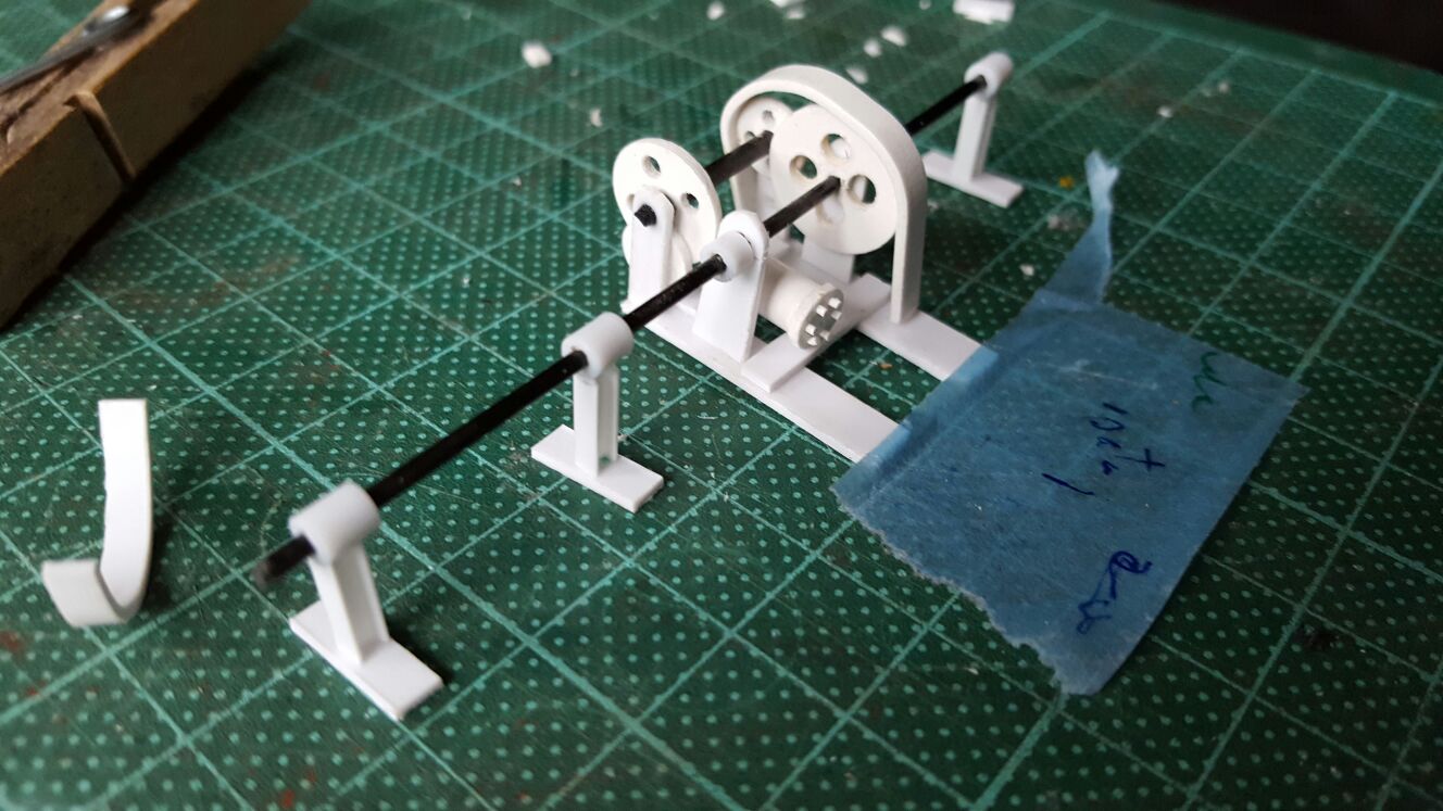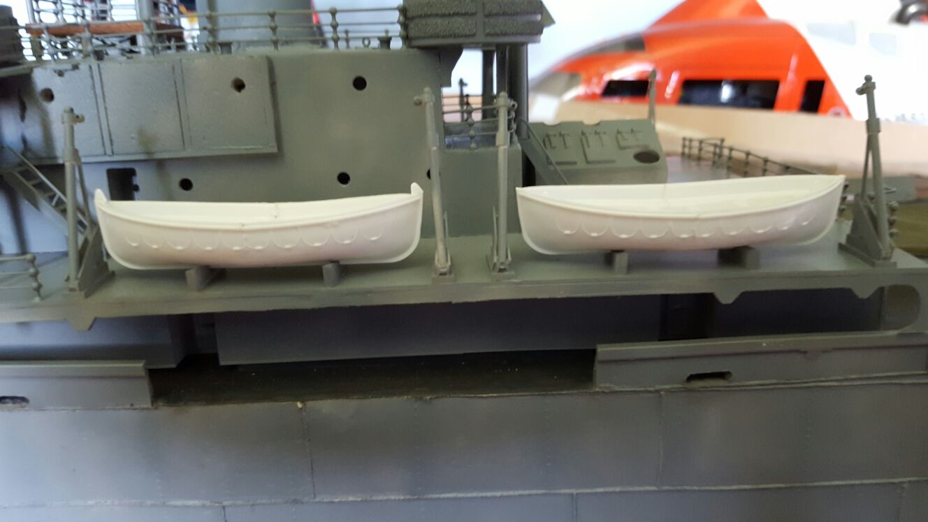 Un poco de pintura en el puente y los pescantes ya están listos para poner lo botes, estos son de graupner ref.:456 , pero son un poco largos por lo que se han cortado, unido y emplatecido hasta que han quedado perfectos. :shock: :shock: :shock: