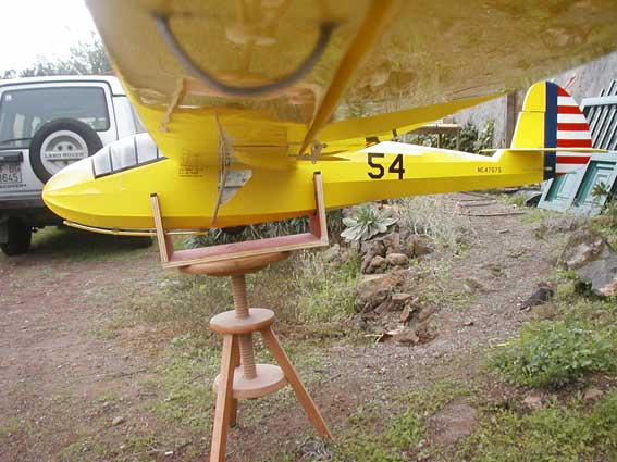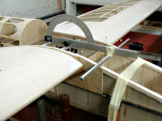 Las alas sólo estan colocadas para la foto, aún queda ponerlas en su sitio definitivo. Las alas tienen que tener 2º de incidencia, en esta parte parte tengo que inventarme algún sistema para poner el avión a nivel y luego dar la incidencia a las alas, ya más o menos lo tengo pensado, así que hay que esperar un poco para ver la fotos. Bueno como vereis creo que no está quedando mal.