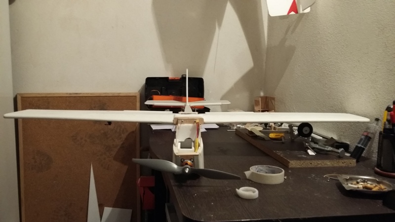 En una 1º fase el avión será de ala alta de 110 cm con flaps , 1 solo motor en el morro con hélice 10x5, bancada antivibracion, y la cola del avión en tope mas alto que admite.