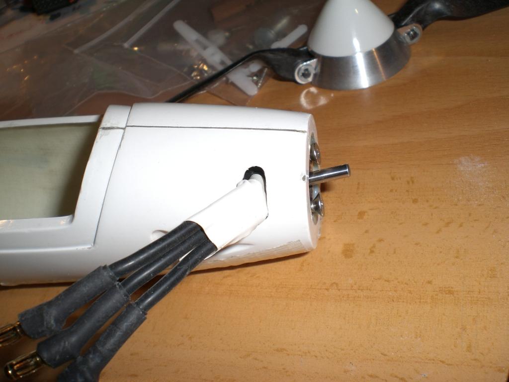 En cuanto al outrunner, la opción suele ser poner el motor de forma que los cables salgan por la parte superior. Previamente, los cables se juntan a lo ancho con termoretractil y éste se pega contra el fuselaje con un poco de epoxi.
