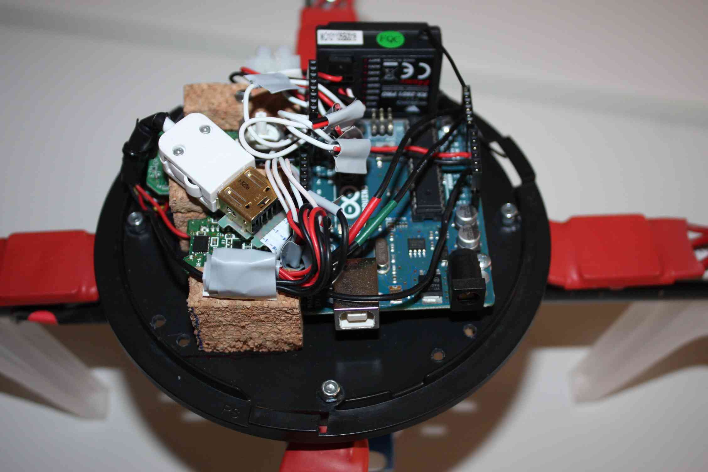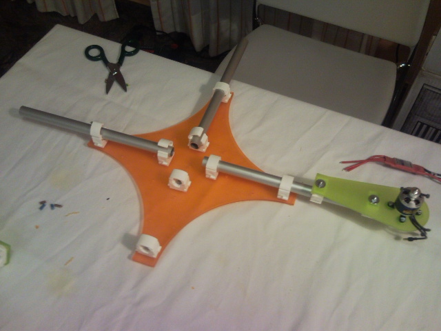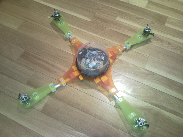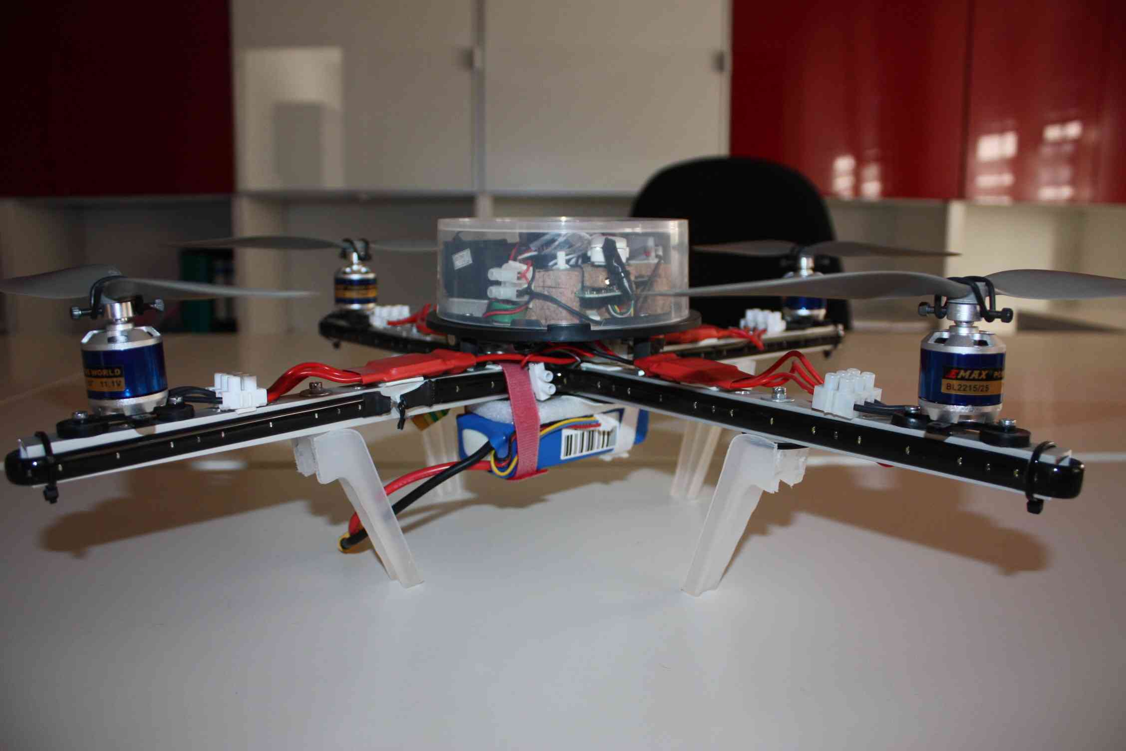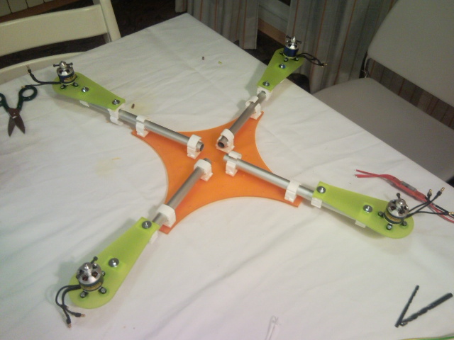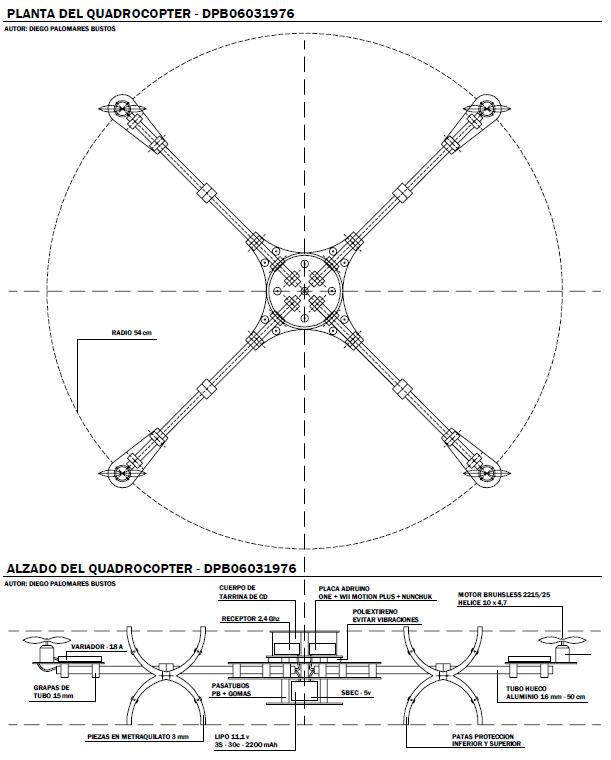 Electrónica: 4 motores emax 2215x25, 4 variadores turnigy plus 18 A, 2 helices derechas y 2 izquierdas de 100X4,7, wii motion plus, nunchuck, placa ardruino one, 1 bec 5v 40a, bateria 3s turnigy 2200 mah 40c, conectores de electrista, receptor y emisora minimo de 5 canales y cuatro tiras de led de los chinos 2 blancas (laterales), 1 roja (cola) y 1 azul (frente).