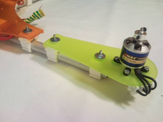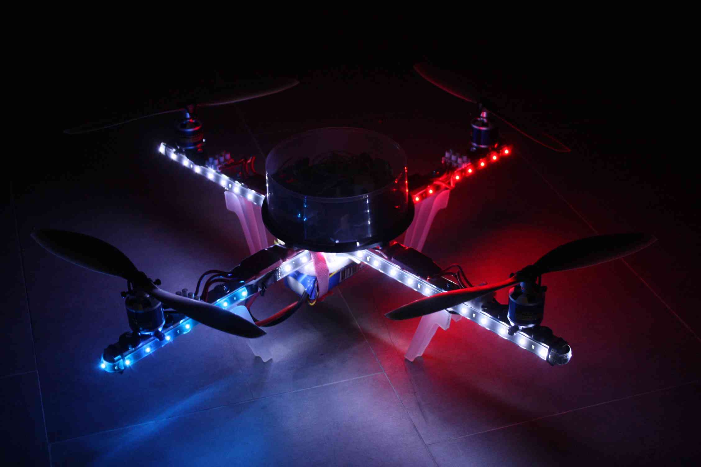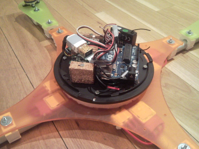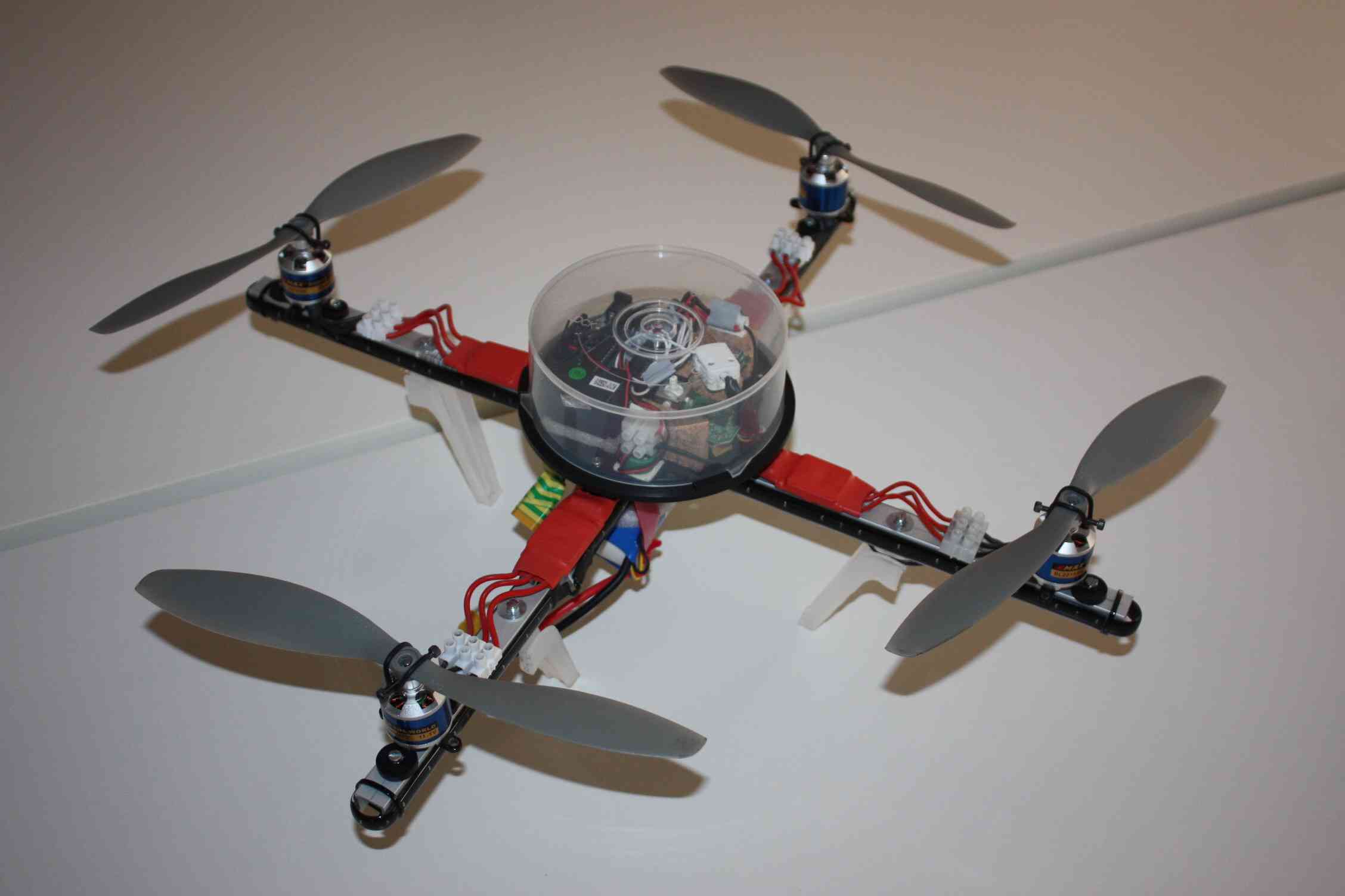 Electrónica: 4 motores emax 2215x25, 4 variadores turnigy plus 18 A, 2 helices derechas y 2 izquierdas de 100X4,7, wii motion plus, nunchuck, placa ardruino one, 1 bec 5v 40a, bateria 3s turnigy 2200 mah 40c, conectores de electrista, receptor y emisora minimo de 5 canales y cuatro tiras de led de los chinos 2 blancas (laterales), 1 roja (cola) y 1 azul (frente).