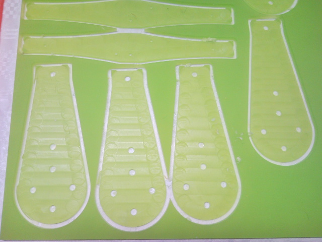 Gracias a todos ya te preguntare cosas draco, bueno con el dibujo en autocad me fui a ver a una empresa que hace corte de todo tipo de plasticos, metraquilato fue el elegido en 2-3mm, en un principio es un prototipo el chasis de las barras deberia de haber hecho mas agujeros para quitar peso pero lo montare asi, tienen una maquina matricial-numerica y es una pasada como corta el plastico, os dejo nas fotos de el mecanizado de las piezas.