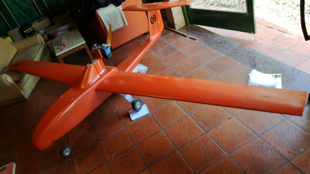 Disponemos de un avión cuya longitud de ala a ala es de 4 mts, para que tengan una idea. Cuenta con 8 servos, 1 para el motor, 4 entre flats y alerones, 1 para el timon y 2 para los elevadores.