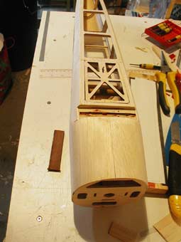 El diedro en las fotos aparece justo al reves, hacia abajo, es decir con forma de V invertida. Los palitos los he sustituido por sedal de pesca, en teoría aguanta 7 kilos de tensión. He puesto sedal entre las dos alas (en la primera foto no estaba puesto de forma que aguanta la forma de V. Tambien entre cada ala y la parte inferior del fuselaje, de forma que evite que el ala se doble demasiado cuando el avión vuele y se "cuelgue" de las alas.