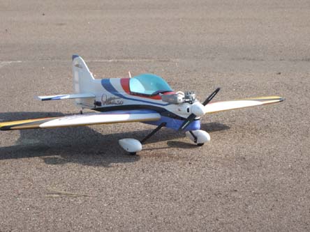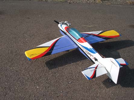 En el cuchillo solo hay que tocar la deriva un poco si le meto toda, se revira por el excesivo mando, pero lo aguanta muy bien, pero en el vuelo 3D me ha decepcionado, quizá yo no sea ningún filigrana pero... lo he traido bajito le doy el palancazo meto motor y derrepente se ha desplomado en pérdida, lo he intentado varias veces, pero.... nada en fin, creo que las cualidades de vuelo de este avión se inclinan bastante más al vuelo sport y F3A en donde se muestra con autoridad, yo nada más despegarlo y ver como penetraba, he dicho para mi "ufff, este de 3D nada", en el aterrizaje hay que traerlo con bastante motor para una vez estar encima de la cabecera de pista, cortar gas y cae lentamente con un planeo controlable, también comentar que situando el CG los más retrasado que indica el manual (a 105mm de borde de ataque del ala) lo he tenido que lastrar con 120 gramos y le he echo 2 vuelecitos, en el segundo bastante más entregado en el y me he divertido bastante, pero corre que se las pela, no se el peso en orden de vuelo, pero lo noto algo pesado para el tipo de construcción que tiene, bueno....