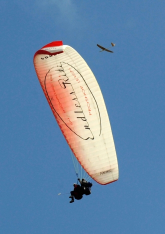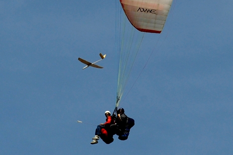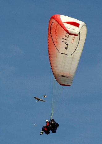 A los gabachos, en el meeting de modélisme de Villeneuve, no se les ha ocurrido mejor idea que juntar a un aeromodelista y a un parapentista en un trapo de dos plazas y pilotar el velero desde el aire.