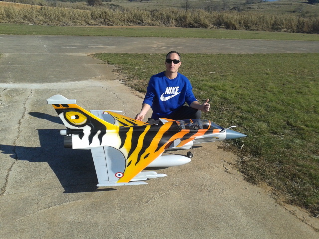Hola compañeros,hace un tiempo adquirí este jet a miquel de fbjets en este foro,todo llego correcto y rápido,el lunes pasado con sol y viento encarado a pista decidí volarlo,era ahora o nunca (la verdad es que tenia muchas ganas),al tema..,llego la hora de carretearlo,probar frenos, y al aire!,salio recto sin apenas tocar la palanca de dirección,deje que corriera bastante por pista y tire de profundidad,cual fue mi sorpresa..,que solo tuve que trimarlo dos clics de profundidad,ni de alerones ni dirección,el avión es por decirlo de alguna manera una pava,a medio gas volaba y a full se lanzaba lo suyo,6 minutos volando con 2 litros de combustible + hopper,es ágil incluso llevando las bombas y misiles instalados (es como lo estrene),en el aterrizaje nada del otro mundo,a un cuarto de gas y morro levantado un poco y jugando con el gas entre un cuarto y medio gas,lo quise entrar tan despacio que a un palmo del suelo se desplomo toco césped y entro en pista (esto hay que mejorarlo)