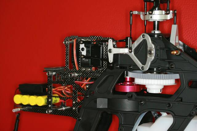 A la conversión con elementos de carbono de toda la bancada de servos y plato ciclico del Raptor para que funcione en modo H3 (creo) y con posibilidad de conectar el plato a 120º o 140º. Saludos.